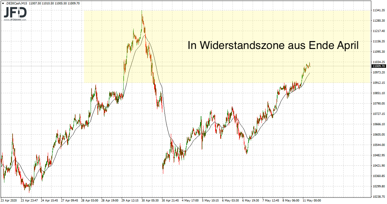 Der positive Nachthandel sorgte dafür, dass wir hier bereits einen ersten Schritt in die Widerstandszone aus Ende April gemacht haben;