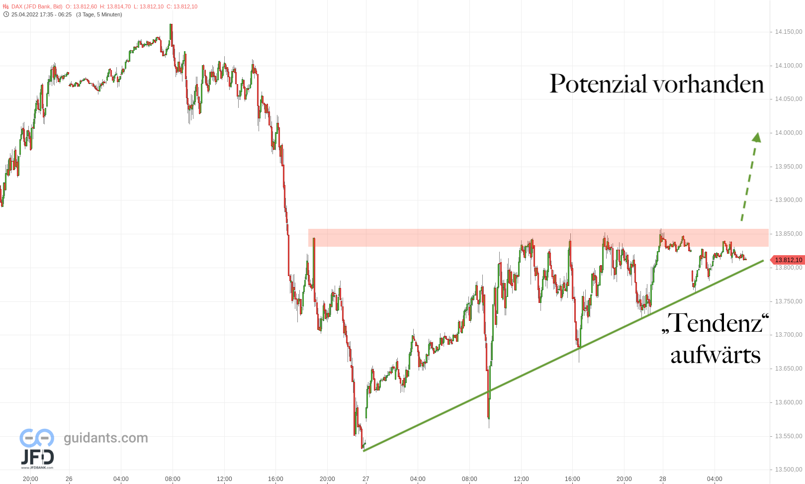 Gelingt hier das Eintreten, kann ich mir einen weiteren Lauf zur 14.000 sehr gut vorstellen. Scheitert der Index dort erneut, sind 13.600 und die Tiefs von gestern weitere Ziele.