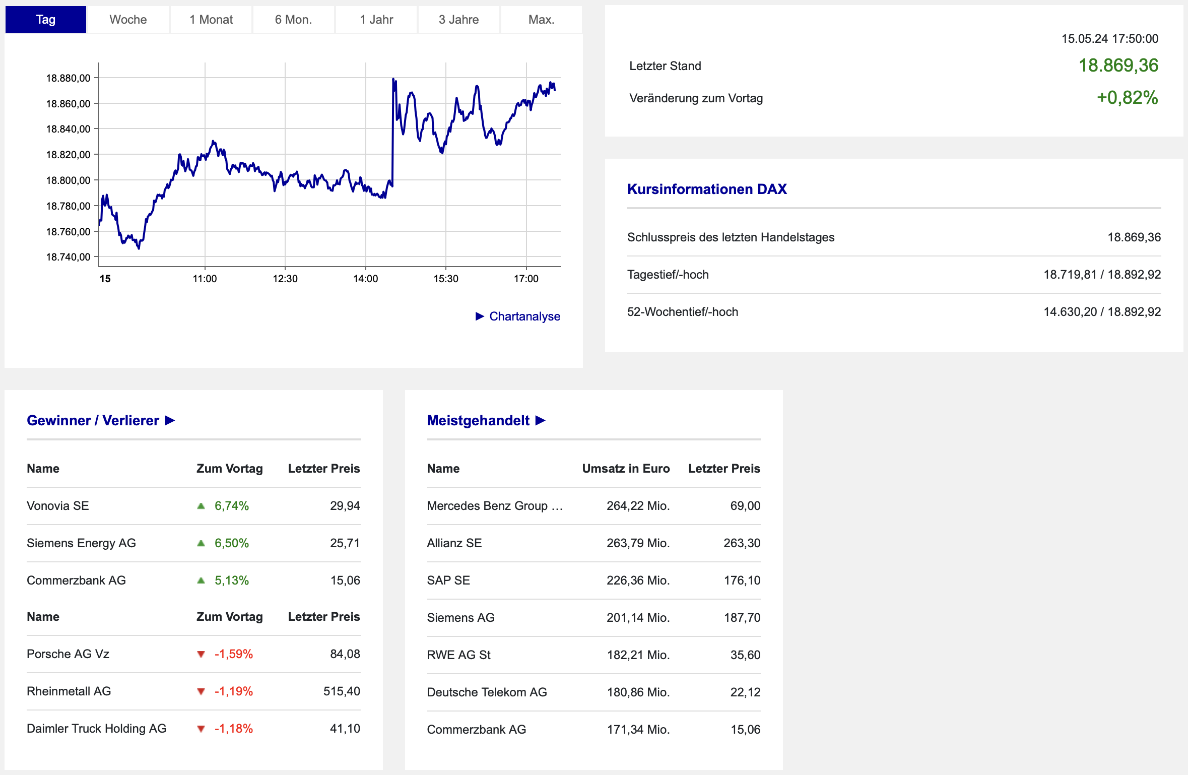Damit folgte auf zwei Minustage dann die Trendfortsetzung, die wir hier anhand der Daten der Börse Frankfurt vom Mittwoch noch einmal im Detail sehen. Rund 170 Punkte Tagesschwankung sind dabei jedoch eher ein Mittelwert bei der Volatilität gewesen: