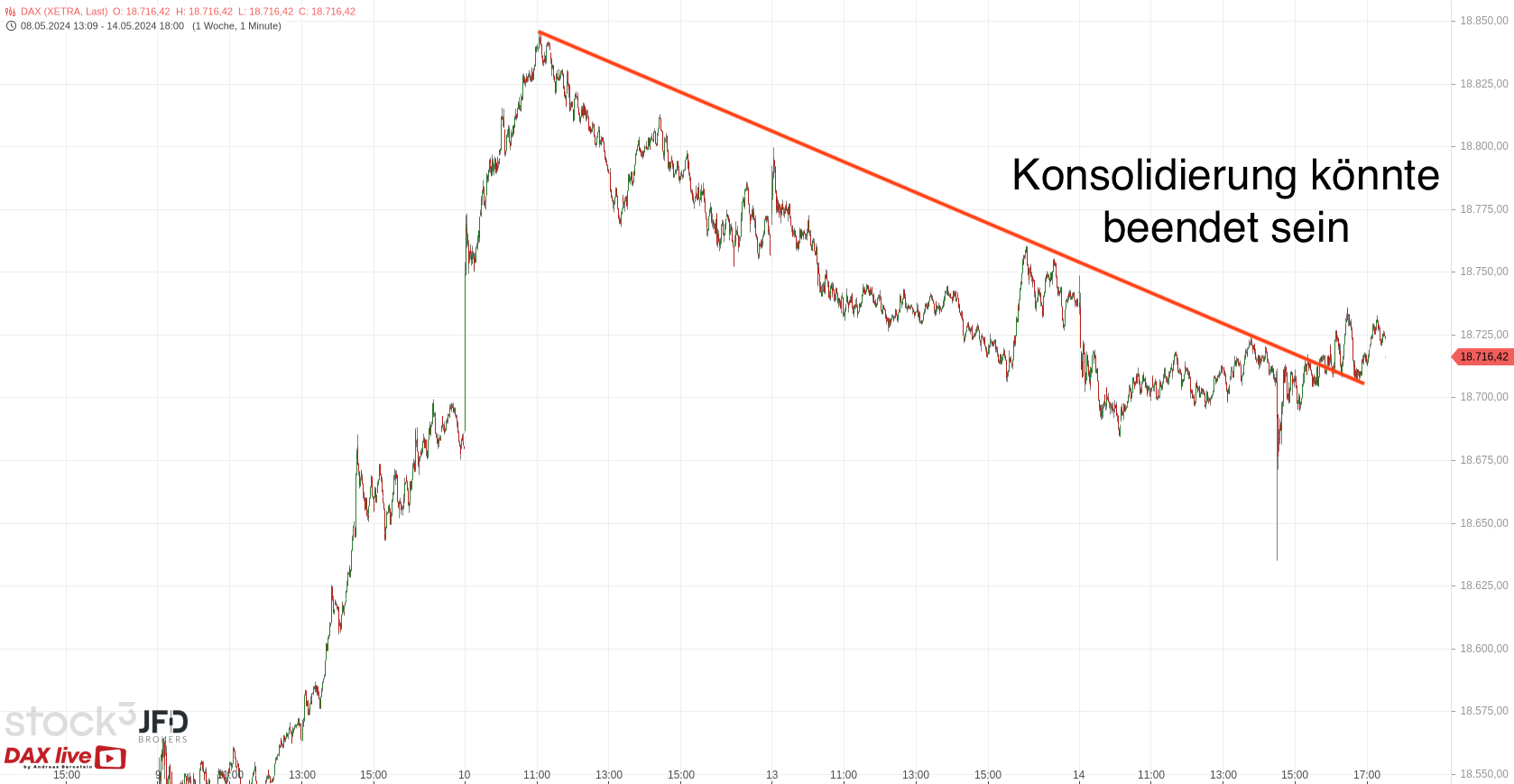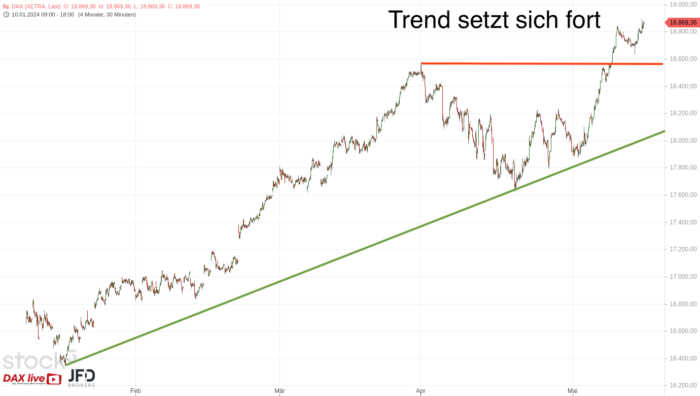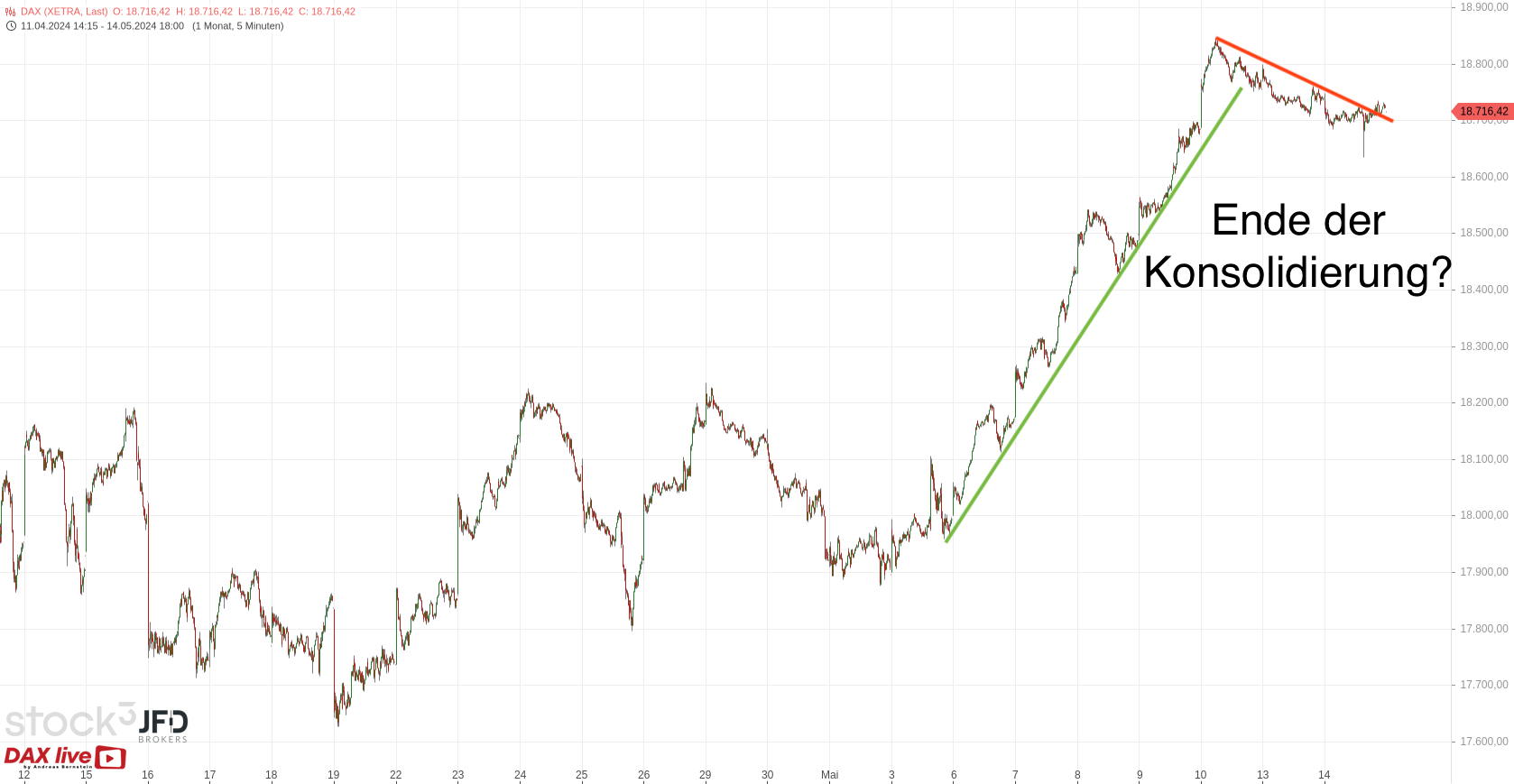 Nachdem der DAX zum Wochenauftakt zwei schwächere Tage zeigte, wurde die Konsolidierung bereits am Dienstagabend abgeschlossen. Dies zeigte der Bruch der Trendlinie an, welche wir in der gstrigen Morgenanalyse zum 15.05.2024 wie folgt darstellten (Rückblick):