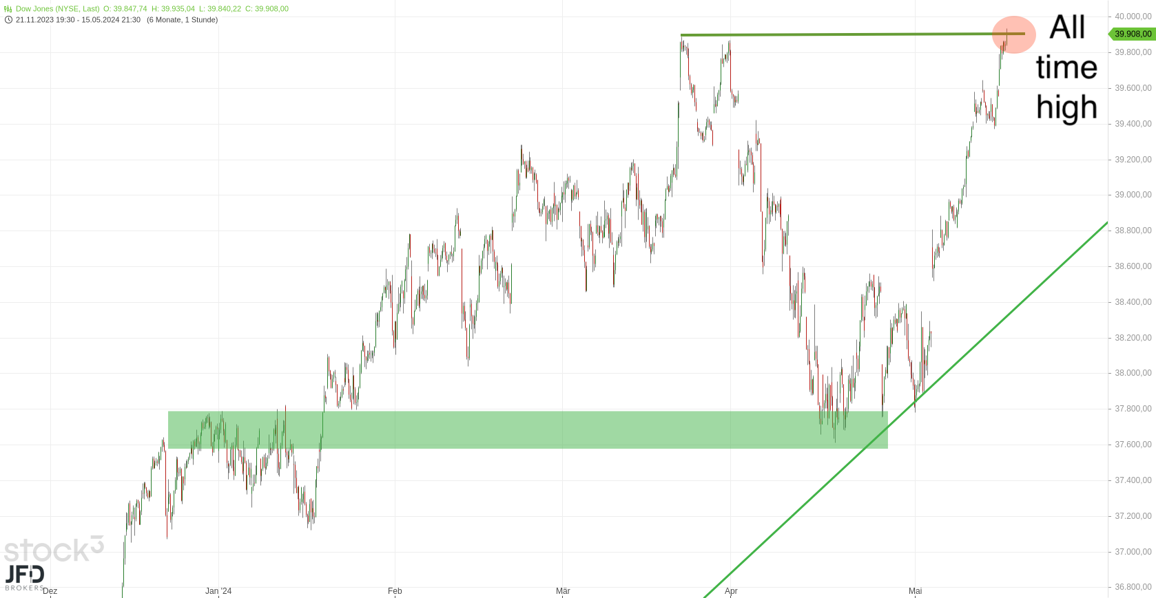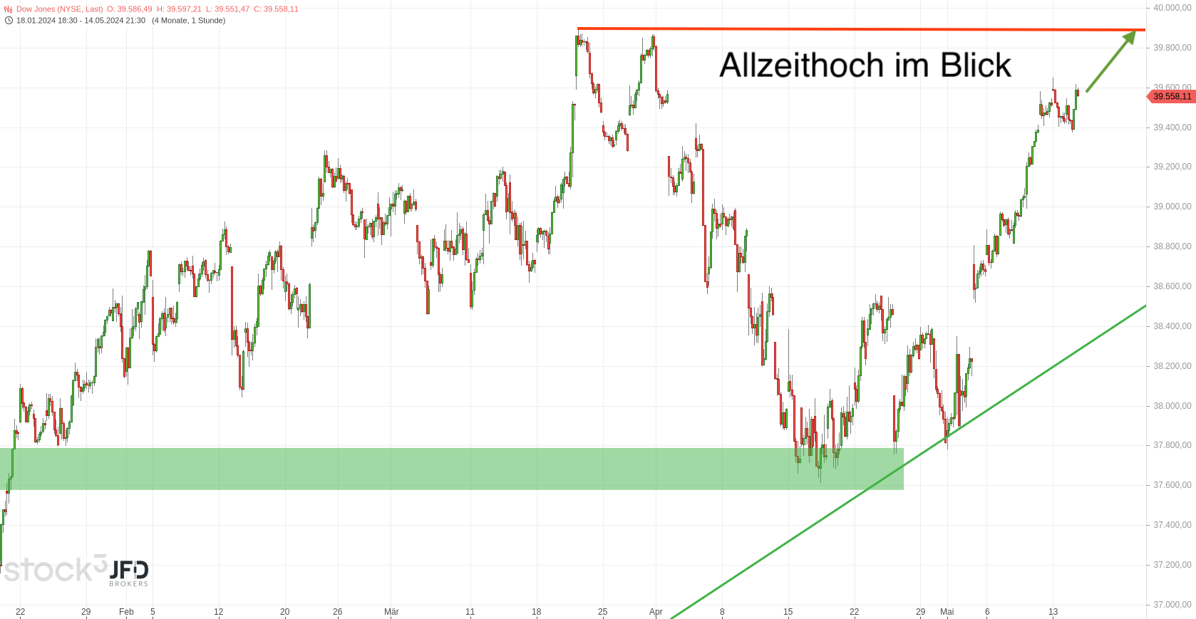Ein ähnliches Bild bot sich im Dow Jones. Sprachen wir noch am Mittwochmorgen über die Strecke zum Allzeithoch (Rückblick):