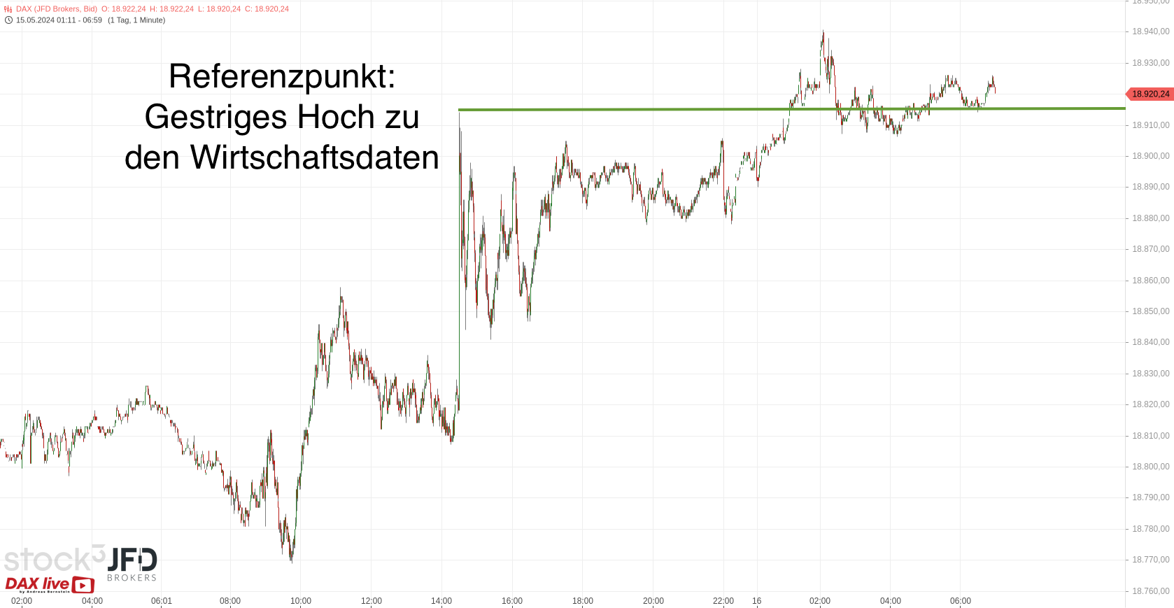 In der Vorbörse ist ein weiteres Hoch zu sehen. Als Referenzpunkt für mein Trading am Morgen halte ich den Hochpunkt nach den US-Daten für relevant und habe ihn im Chartbild der JFD-Indikationen verankert (einige Punkte über dem XETRA-Level aber optisch gleich mit allen anderen Charts):