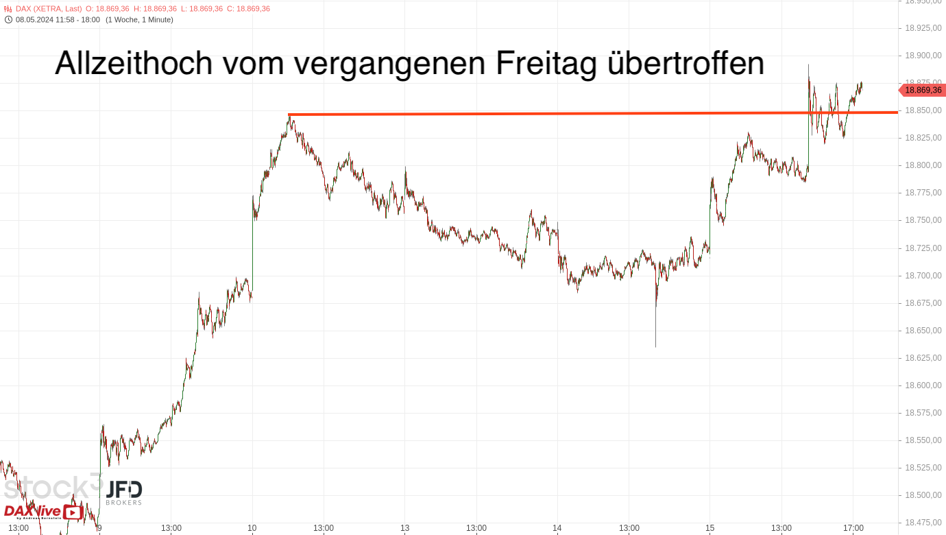 Der Ausstieg an diesem Zielbereich war richtig, denn kurze Zeit später startete der Index einen neuen Anlauf zur Oberseite und überschritt dabei auch die 18.800er-Marke. Sie gilt als letzte runde 100er-Marke vor dem Allzeithoch. Mit den US-Daten am Nachmittag, welche die Angst vor zunehmender Inflation wieder eindämmten, konnte der Markt sich dann nach oben erneut absetzen und somit neue Hochs definieren.