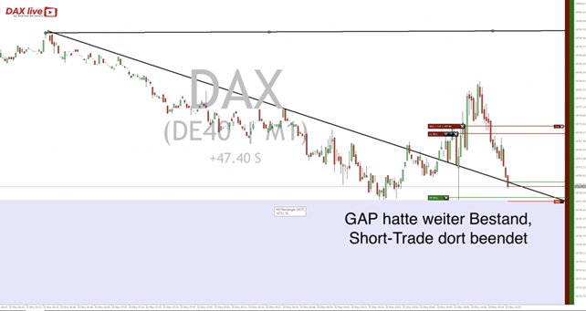 Mit einer Kurslücke startete der Index dann auch in den Handel und zeigte dabei jedoch keine Ambitionen, die vorbörslichen Hochs noch einmal anzulaufen. In diese kleine Schwächephase hinein startete ich eine Short-Positionierung hatte dabei das GAP zum Ziel, was sich zum Vortag (hier farbig markiert) zeigte: