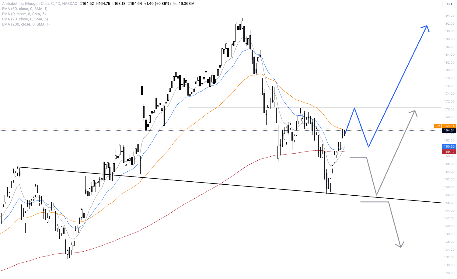 Aus technischer Sicht befindet sich die Alphabet Inc. (Google)-Aktie in einer interessanten Situation. Seit dem Korrekturtief bei 148 USD stieg die Aktie um 11% innerhalb von 9 Handelssessions. Dies ist bis dato als neuer Impuls zu werten. Das Hauptszenario sieht nun einen direkten Anstieg bis 170,50 USD vor, um hier Schwung für einen Ausbruch Richtung Allzeithoch zu nehmen.