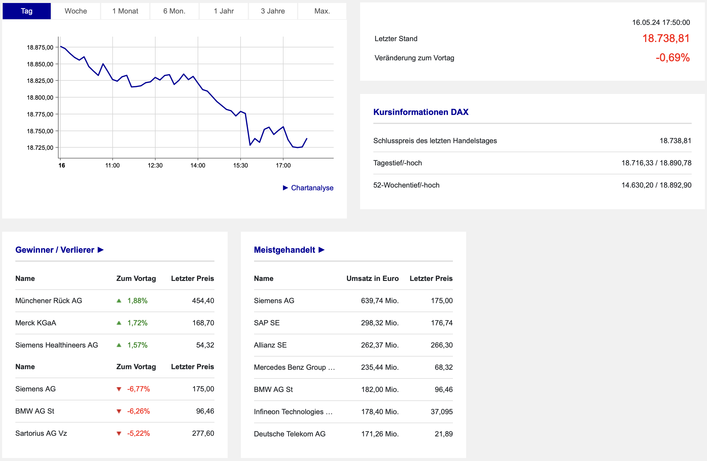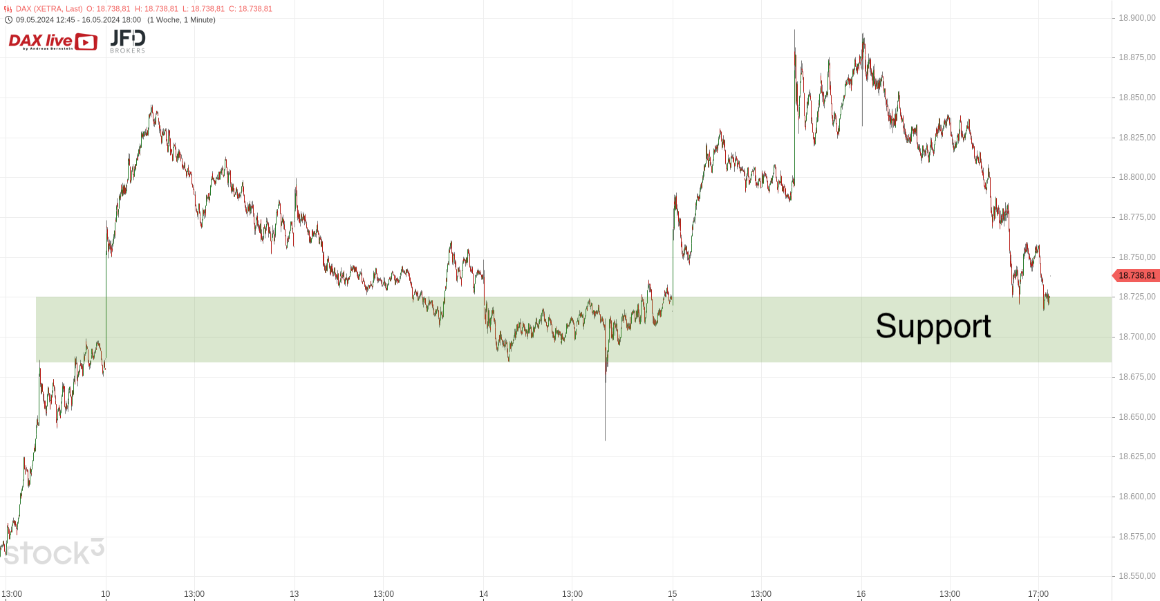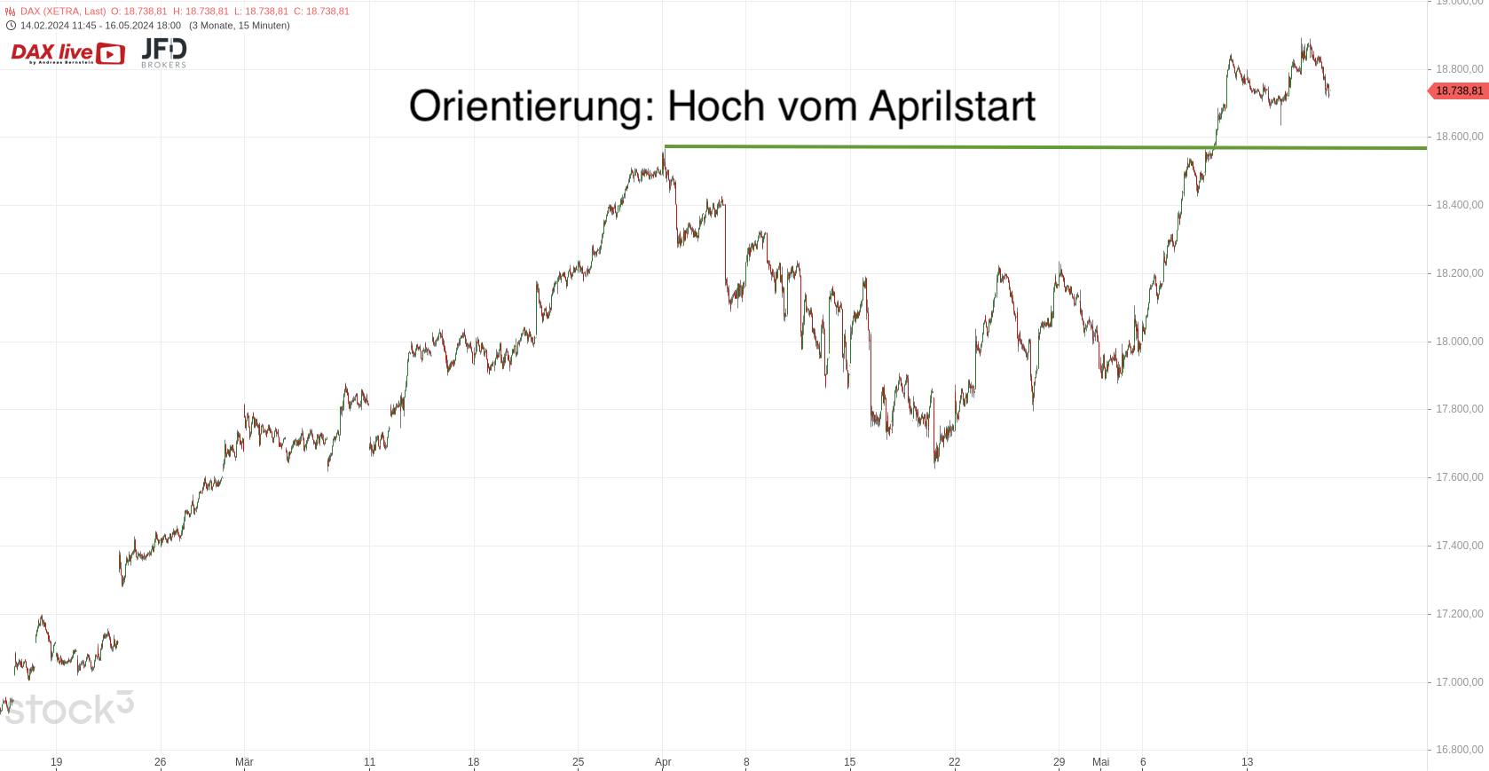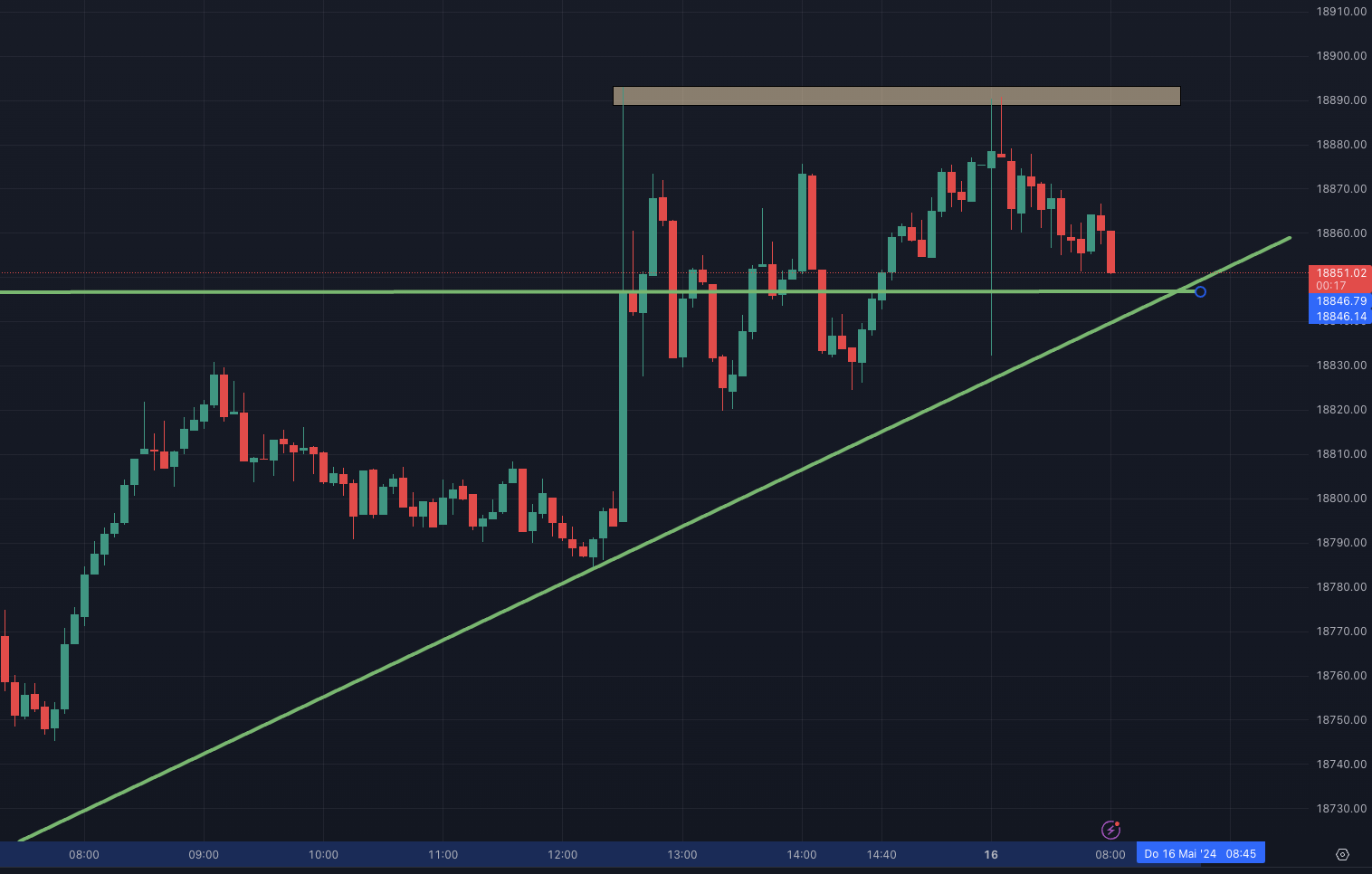 Am Donnerstag gelang es dem DAX nicht, den Trend noch einmal fortzusetzen. Kam es noch am Dienstag zu einer Erweiterung der Allzeithochs, war schon nach den Wirtschaftsdaten zu spüren, dass der Index sich eher an den Hochs der Woche zuvor ausrichtete. Wir hatten diese in der gestrigen Morgenanalyse zum 16.05.2024 wie folgt skizziert (Rückblick):