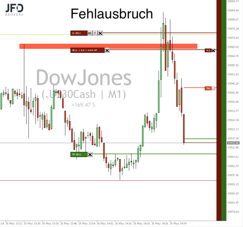 Für den Dow Jones stand der Run zum Allzeithoch erst später an. Damit verbunden war gestern in der Session ein Anlauf zur 40.000 als psychologische Marke spannend und ist auch erfolgt. Beim Anlauf dorthin ergaben sich immer wieder Short-Chancen, die dynamisch erfolgten und beispielsweise mit diesem Trade von mir eingefangen werden konnten: