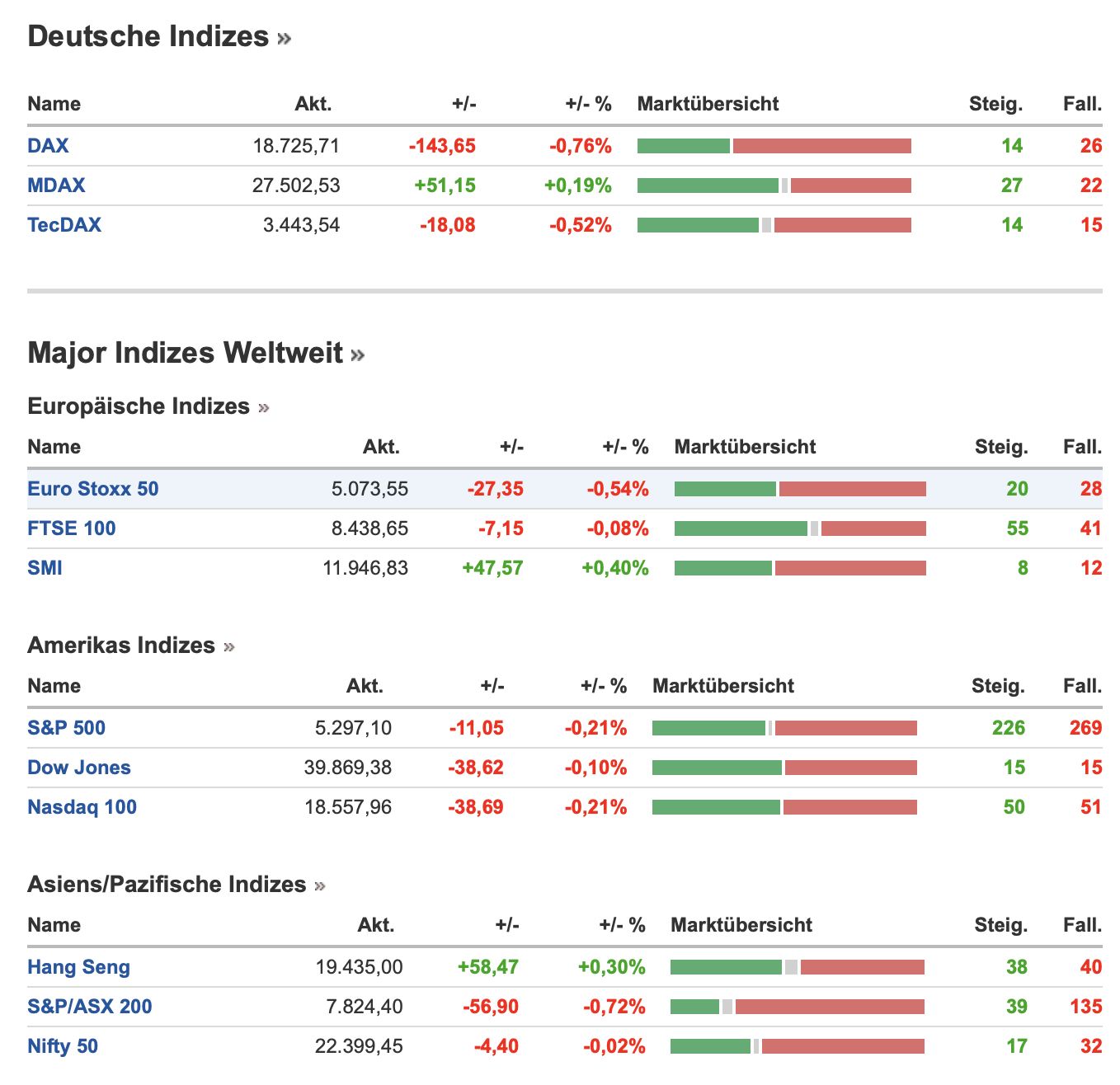 Letztlich schlossen die großen Indizes an der Wall Street mit einem kleinen Minus, nachdem intraday neue Rekorde verzeichnet werden konnten. Als Zusammenfassung aller Indizes inklusive Asien ist diese Übersicht am Morgen hier verankert: