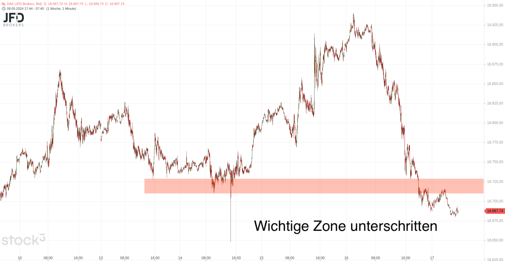 Am Morgen gab es direkt Abgaben, die zu diesem Level führten. Im Livetradingroom hatten wir dies besprochen und auch die XETRA-Hochs markiert, die sich mit der Eröffnung am Donnerstag und dem Hoch der Mittwochsdaten auf einer Schwelle befinden: