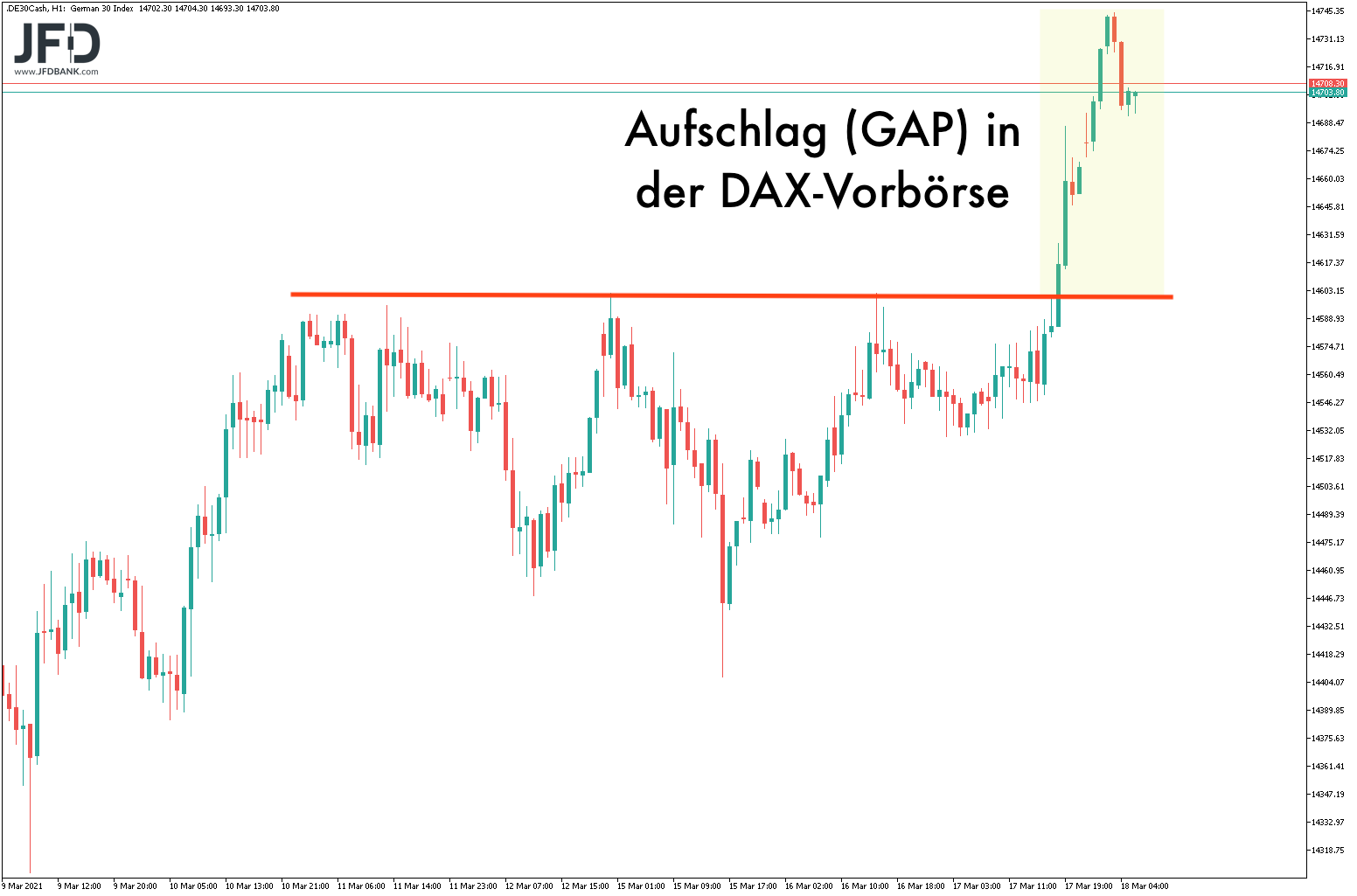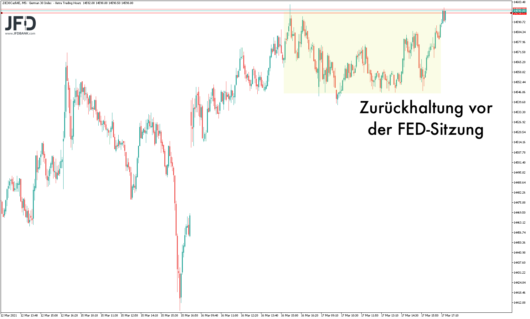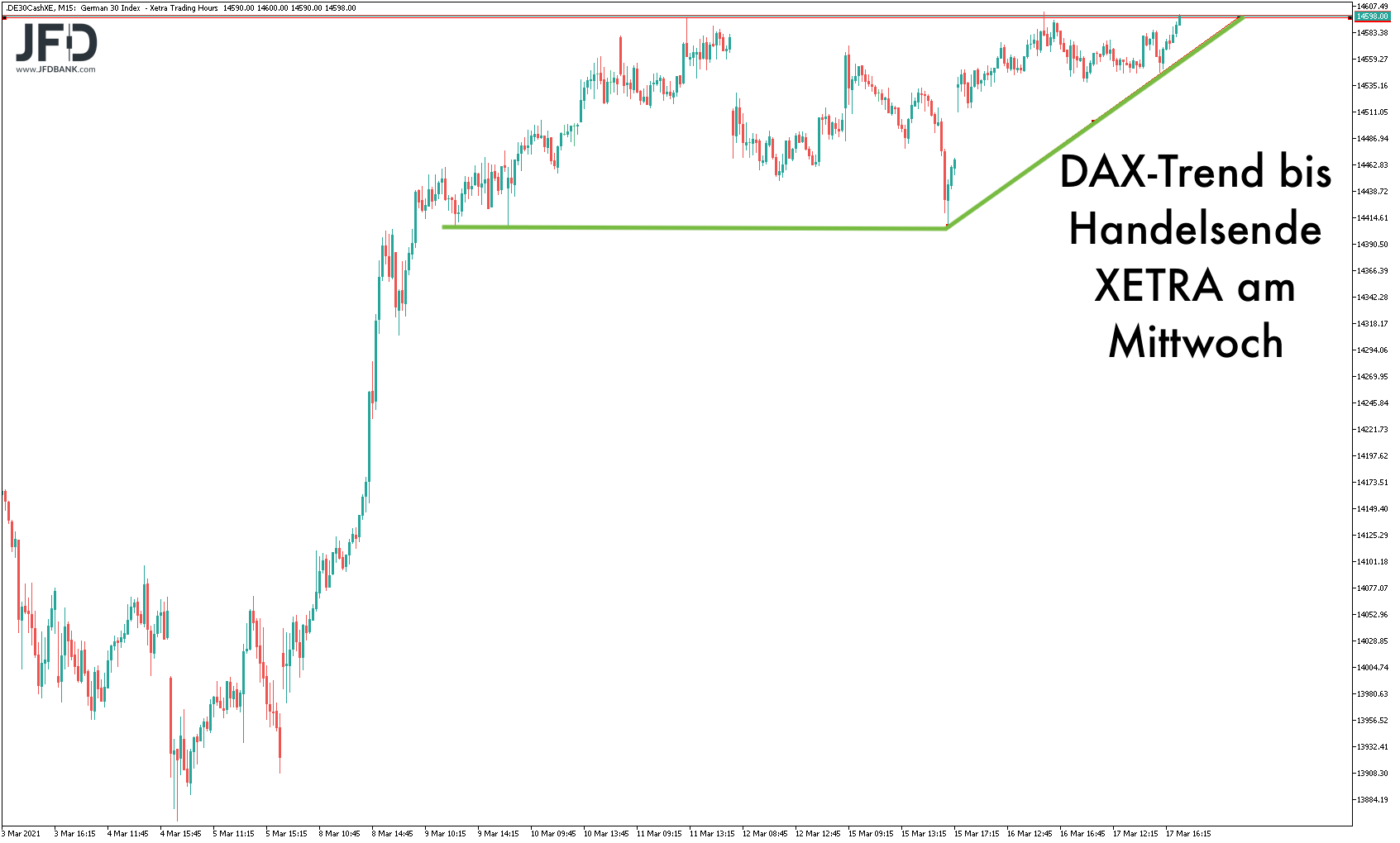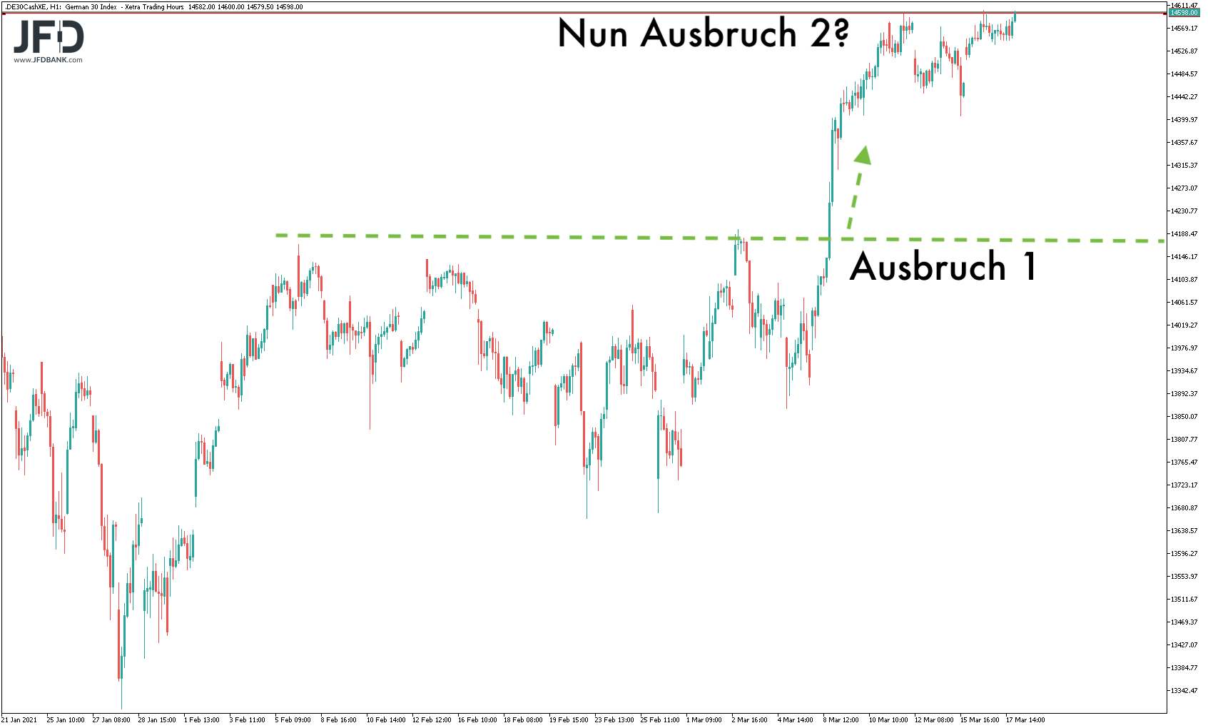 Basierend auf der jüngsten DAX-Range ist nach dem großen Ausbruch über 14.197 Punkte nun ein ähnliches Szenario zu erwarten. Das mehrmalige Anlaufen der 14.600 bildet technisch einen Widerstand, welcher bei Überschreitung heute weiteres Momentum freisetzen sollte: