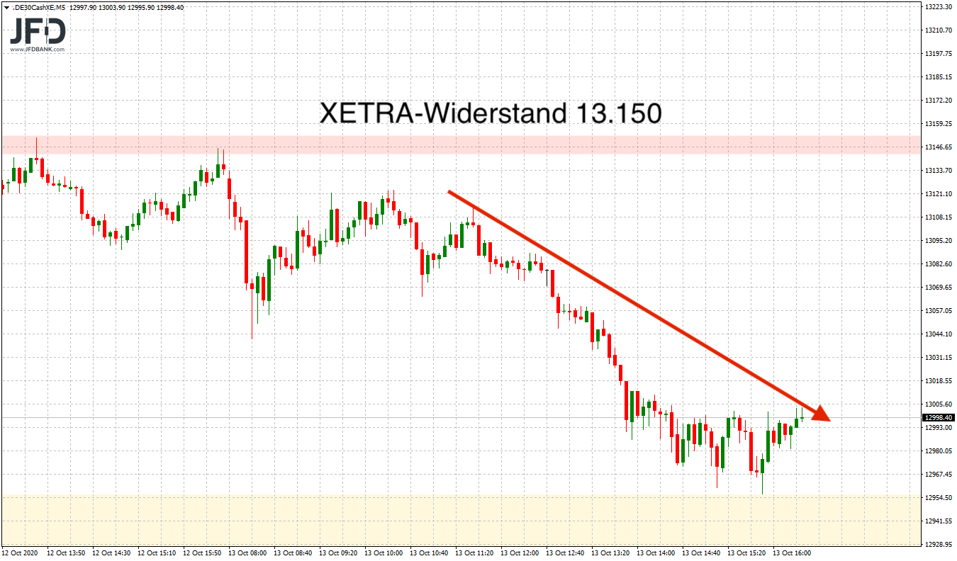 Kurse über 13.100 wurden immer wieder abverkauft und am Nachmittag fiel der DAX dann auf seine psychologisch wichtige Marke von 13.000 Punkten zurück und unterschritt diese. Bis recht genau zum Tief des vergangenen Donnerstags hielt dieser Druck an, bevor zum Handelsende XETRA diese runde Marke zurückerobert wurde.
