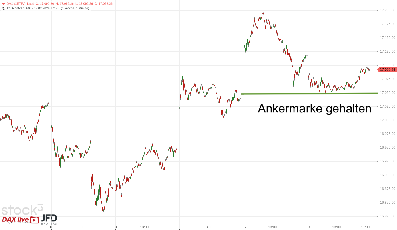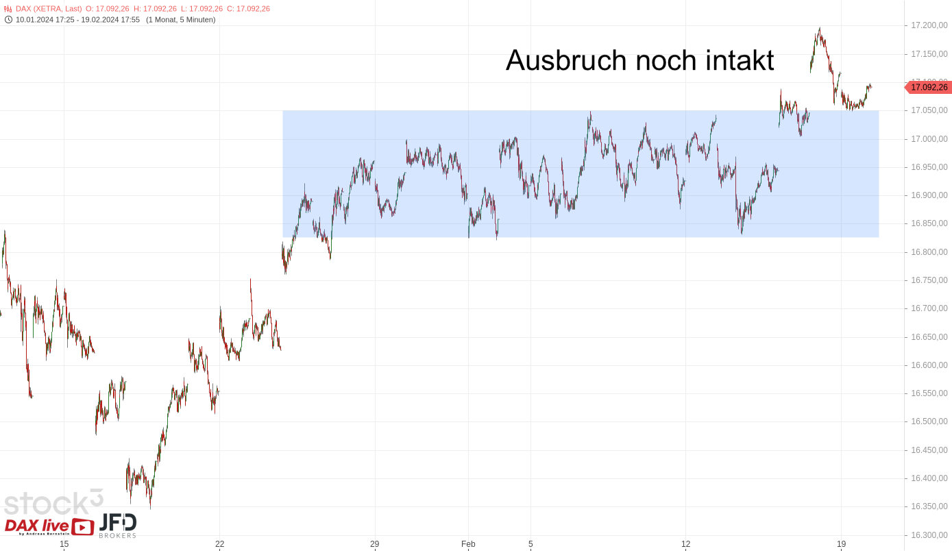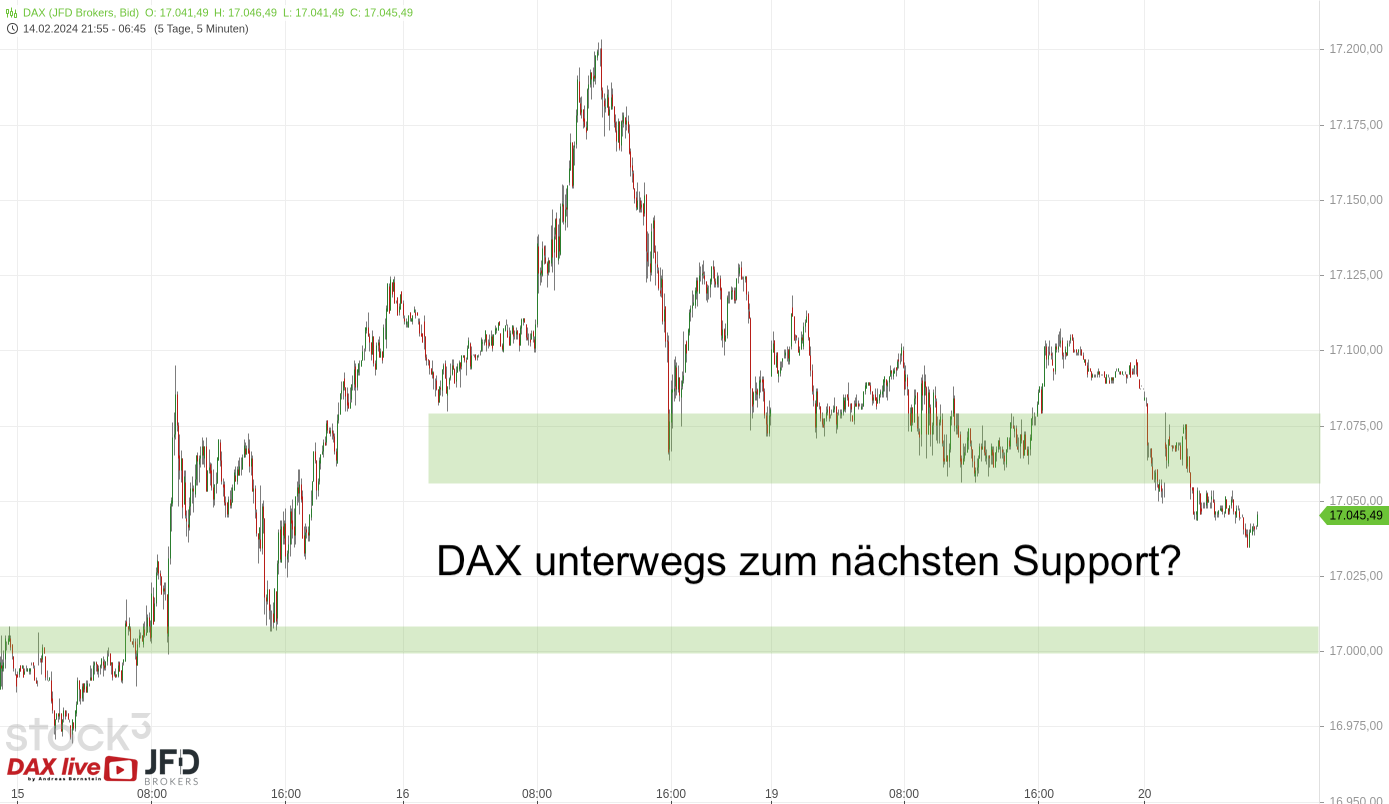 Kann sich der DAX darüber behaupten, gehe ich von weiteren Anstiegen aus und dem erneuten Test der Allzeithochs bei rund 17.200 Punkten. Aus der Vorbörse heraus ist jedoch eher Schwäche zu sehen: