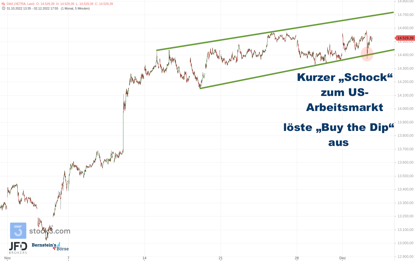 Der Endloskontrakt steht weiterhin unter den Monatshochs bei rund 14.600 Punkten verankert und glich am Freitag ja bereits den Effekt vom US-Arbeitsmarkt vollständig aus: