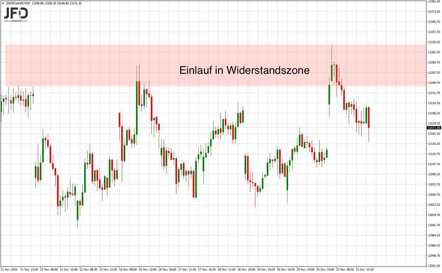 Bereits mit einem GAP gestartet konnte der DAX das alte GAP bei 13.200 direkt zum Start in den XETRA-Tag schließen und sich damit eine gute Ausgangsbasis für weitere Kursgewinne schaffen. Die Ziele waren auf der Oberseite wie folgt skizziert (Vortages-Chartbild):