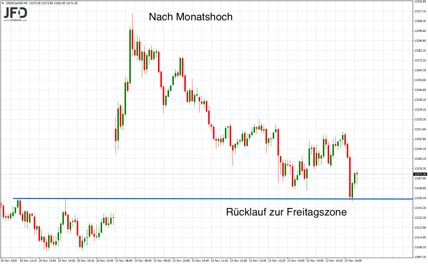 Hintergrund war erneut eine Meldung zu einem Covid19-Medikament. Am Wochenende wurde vermeldet, dass Impfungen von den bisherigen Herstellern BioNTech und Moderna in den USA bereits schon Mitte Dezember erfolgen könnten. Auch in Deutschland bereiten sich Impfstationen für Ende des Jahres auf einen Einsatz vor. Hierzu kam die Meldung, dass nun auch ein dritter Hersteller in der Pipeline steht. AstraZeneca hat ebenfalls erfolgreiche Studienergebnisse vorzuweisen und sorgte damit insgesamt für Entspannung am Markt.