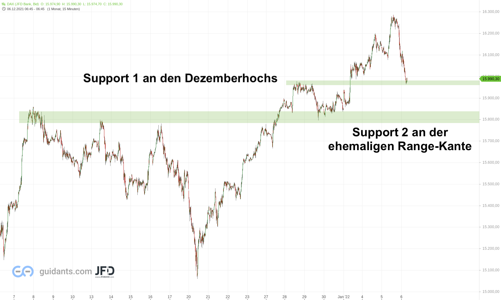 Auf der Suche nach Supports oder gar dem nächsten Level in der Korrektur fallen zwei Bereiche direkt ins Auge. Einmal das Dezemberhoch, was wir bereits an den letzten beiden Tagen am Morgen besprochen hatten und um 15.974 Punkte verankert ist, und dann noch der breite Bereich der ehemaligen Range-Kante um 15.800 Punkte.