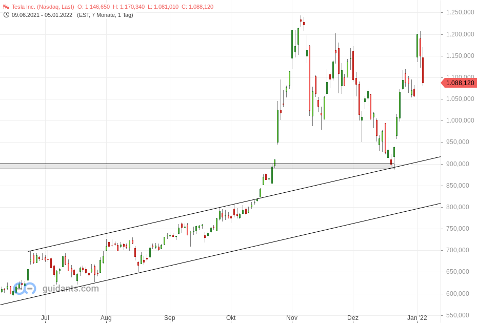 Marktteilnehmer waren erschrocken darüber. Bisher dominierte die Ansicht, mit der Corona-Variante Omikron verschiebt sich die Zinsanhebung etwas nach hinten und vor allem Technologieunternehmen haben weiterhin Spielraum bei der Fremdfinanzierung. Doch genau dort wurden gestern die mehrheitlichen Verkäufe am Abend durchgeführt. Eine Alphabet sank um 4 Prozent und auch eine Tesla kam wieder deutlich unter die "Räder":