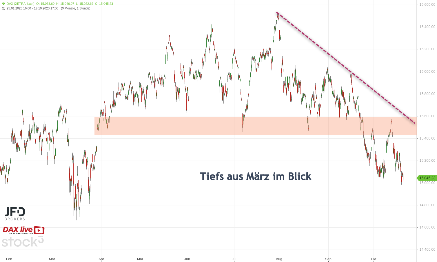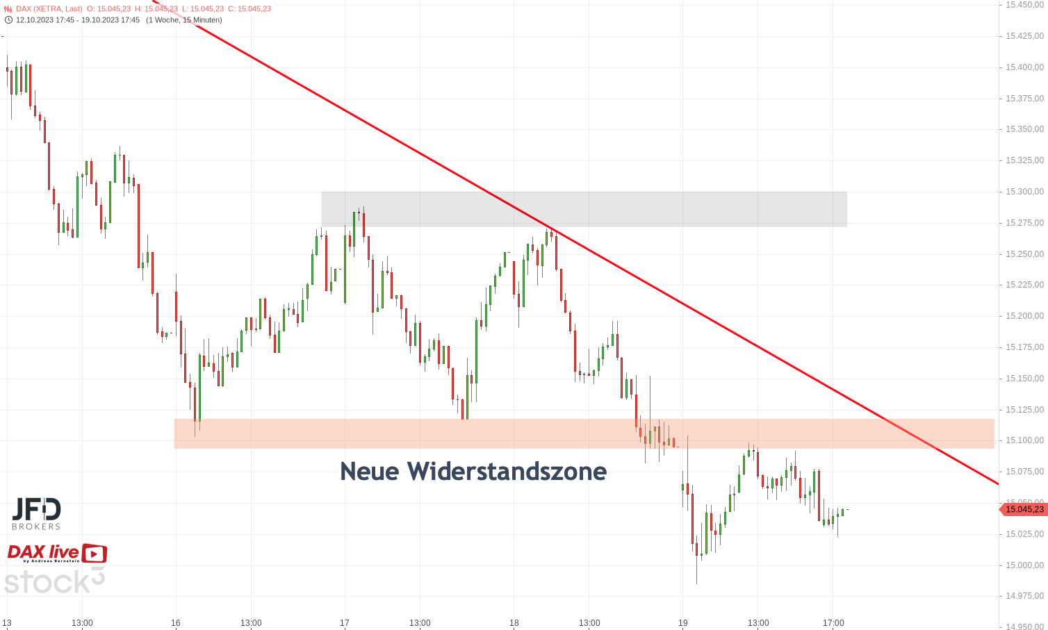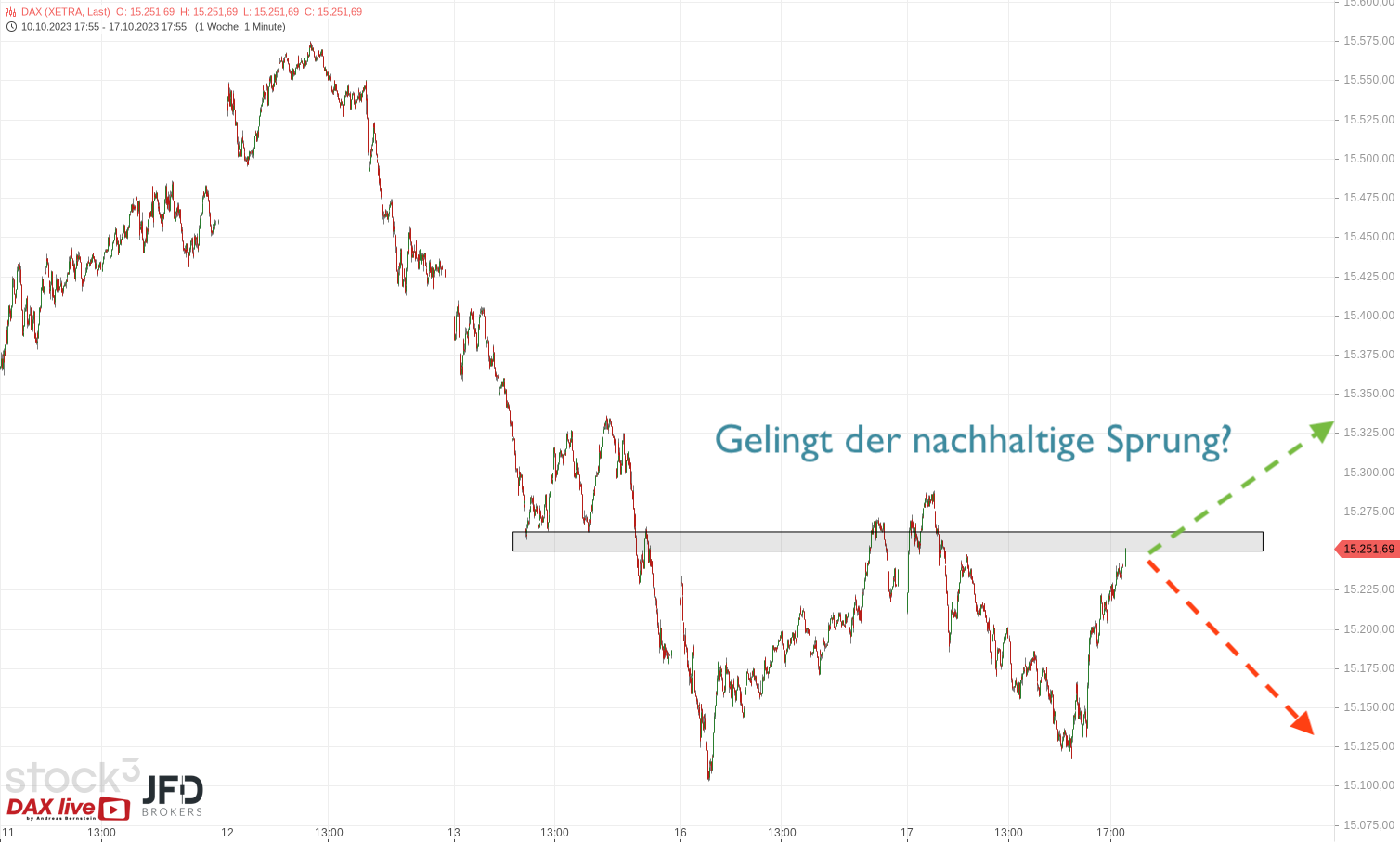 Das Hauptaugenmerk in der Tagesanalyse zum 18.10.2023 war der Bereich um 15.250 Punkte, denn dort schlossen wir nun bereits zwei Tage in dieser Woche und hatten Intraday immer wieder entsprechende Gegenbewegungen gesehen: