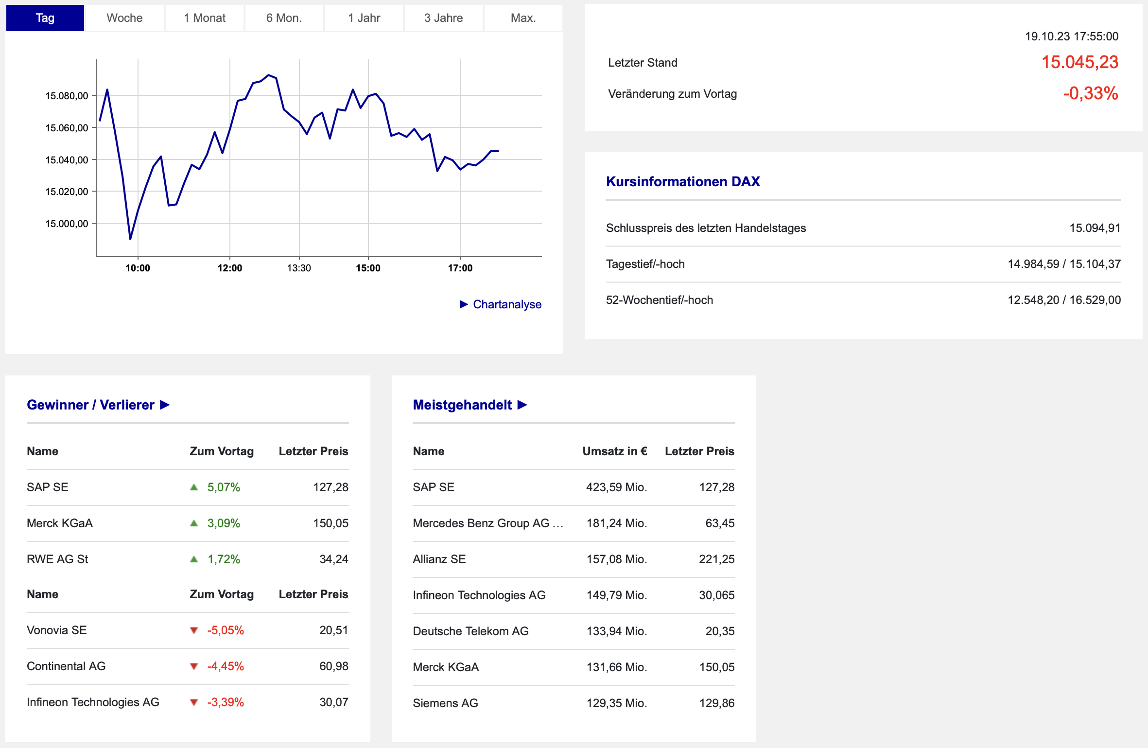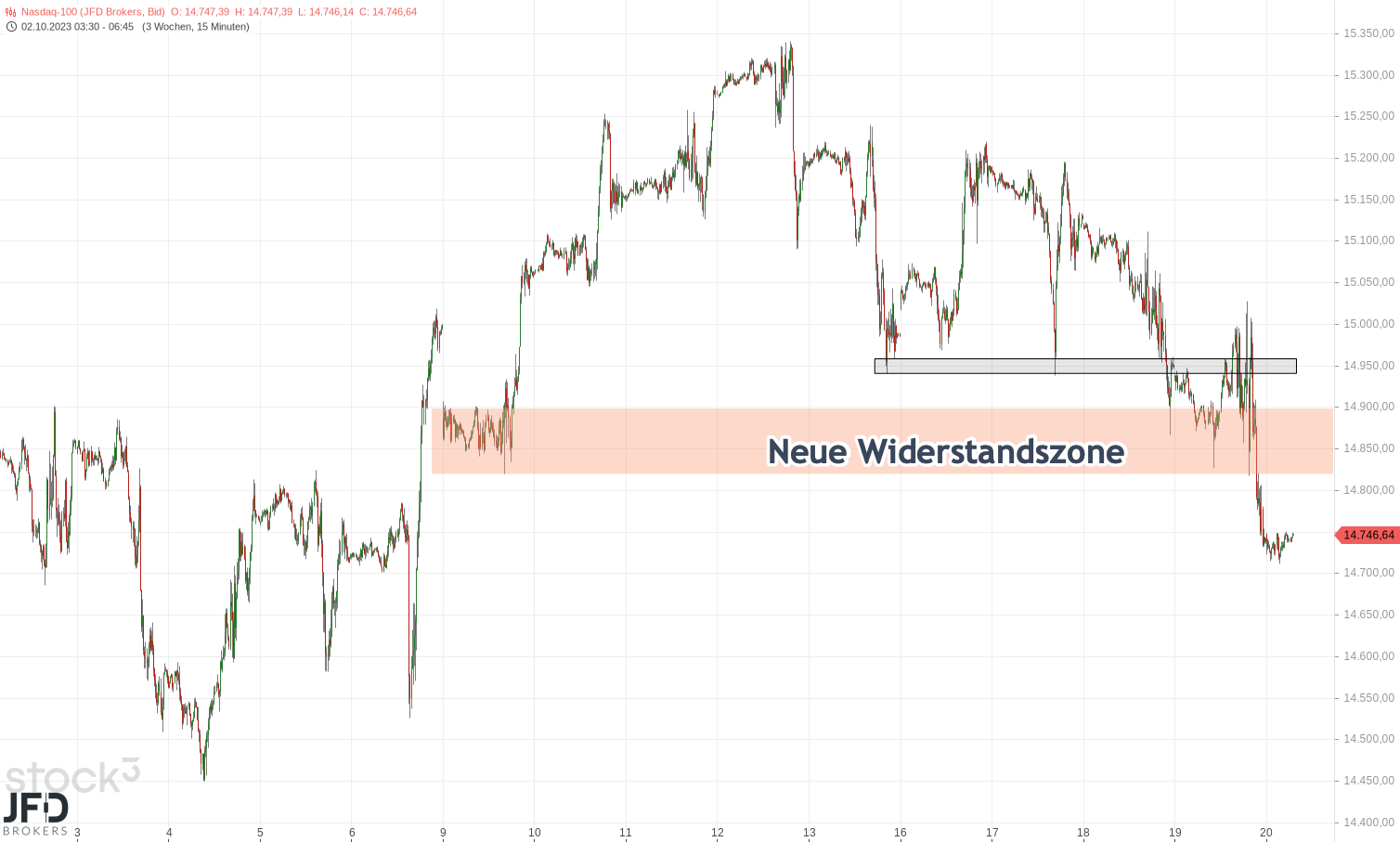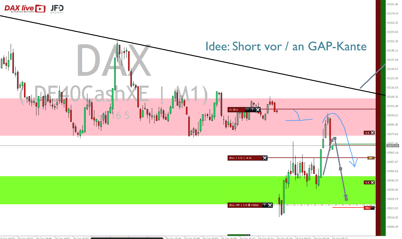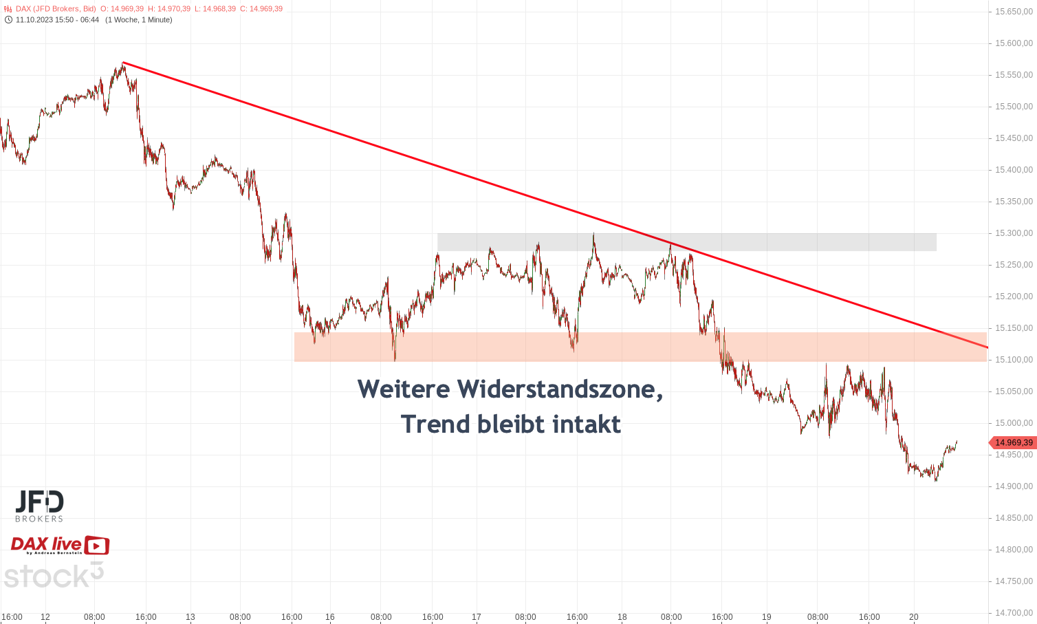 Das Hauptaugenmerk in der Tagesanalyse zum 18.10.2023 war der Bereich um 15.250 Punkte, denn dort schlossen wir nun bereits zwei Tage in dieser Woche und hatten Intraday immer wieder entsprechende Gegenbewegungen gesehen: