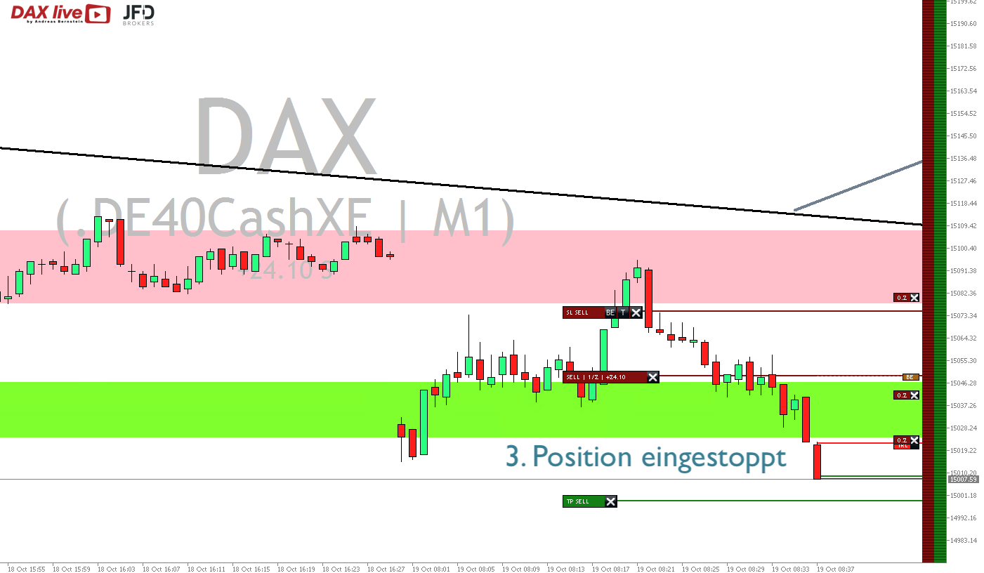 Der Donnerstag vollzog diese Entwicklung weiter und formierte direkt zum Handelsstart erneute Schwäche. Das so entstandene GAP war für mich erst einmal mit dem Bereich der Mittwochabend-Tiefs der Widerstand, welchen ich im mittelfristigen Trend mit einer Short-Order einfing:
