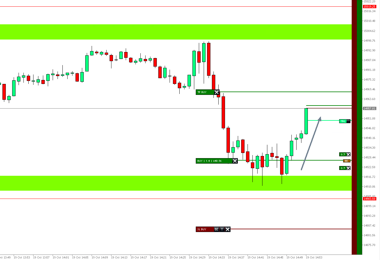 Im weiteren Verlauf wurde diese Positionierung noch einmal ausgebaut - die Stopp Sell Orders siehst Du bereits im Chartbild - und dann an der runden Zielmarke 15.000 per Take Profit komplett im Gewnn veräußert: