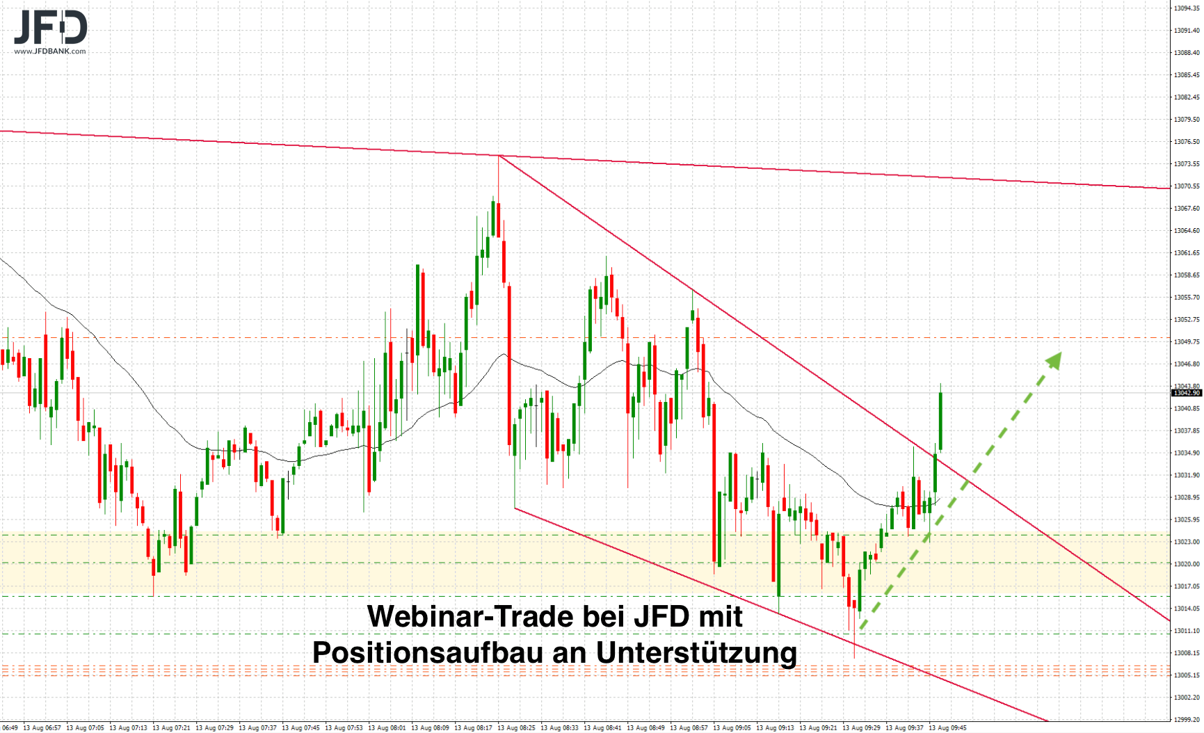 In der Folge kam es zu einem Test der Region knapp über 13.000 welchen wir im Livetrading-Webinar besprochen hatten und an dem auch ein entsprechender Trade absolviert wurde: