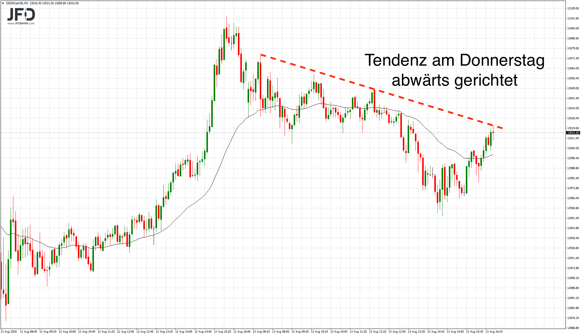 Nach der unveränderten Eröffnung am Donnerstag konnte sich zuerst noch einmal die Tendenz der Vortage durchsetzen. Bis 13.075 stieg der DAX an, erreichte damit jedoch nicht mehr das Vortageshoch bei 13.101 Punkten.
