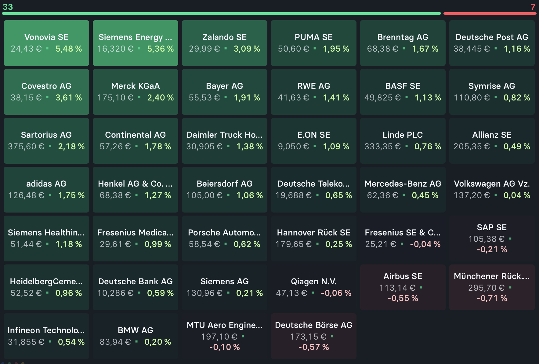 Hier stach vor allem die Vonovia-Aktie heraus, die neue Kaufempfehlungen erhielt. Dies ist bei den 33 Werten in der Pluszone am Abend über die Heatmap gut nachzuvollziehen: