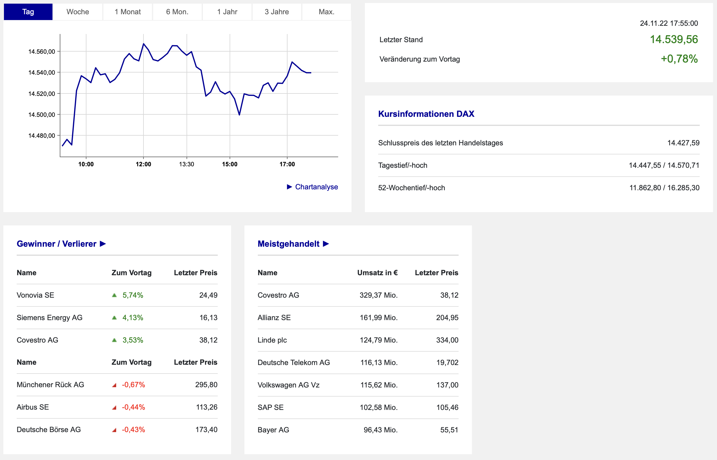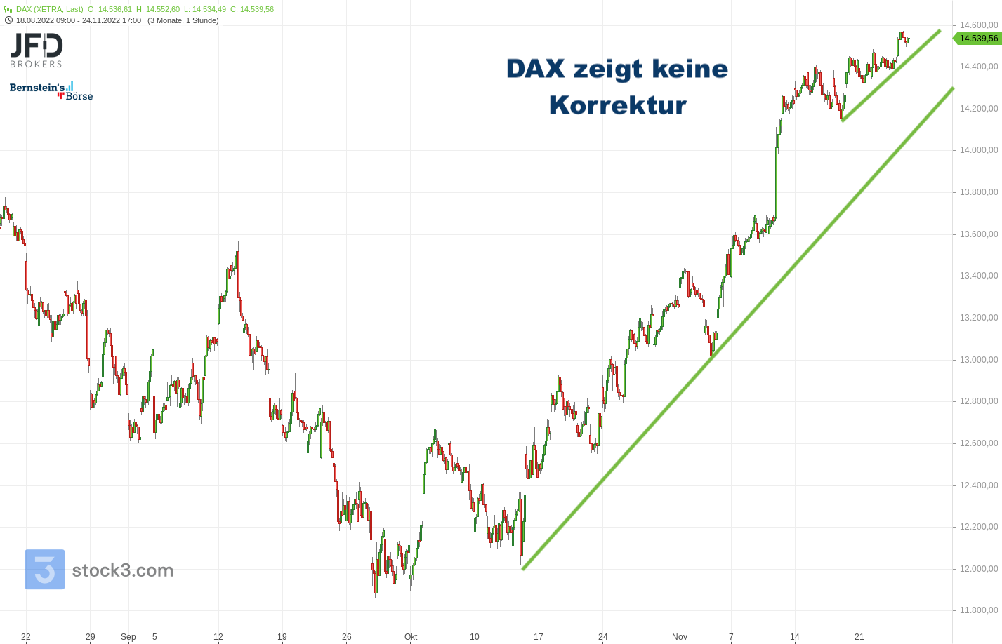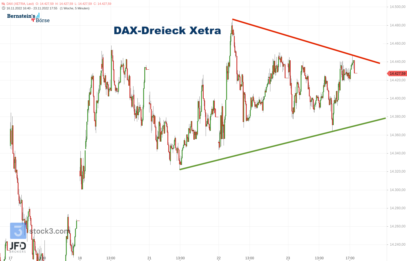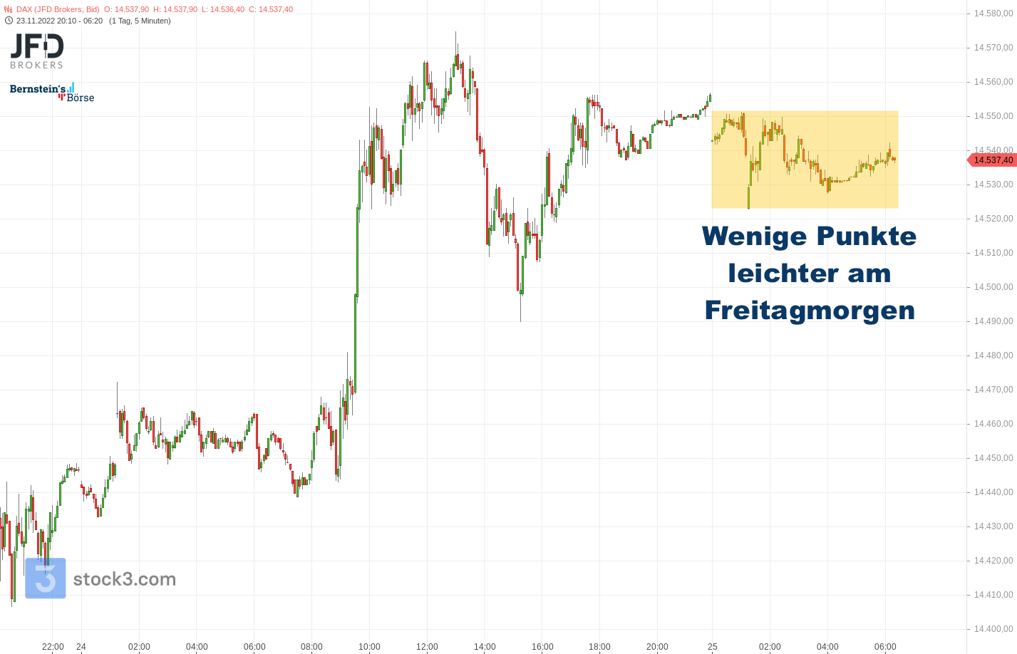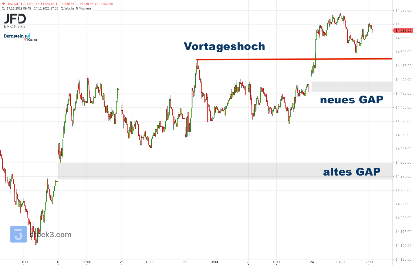 Der US-Feiertag hat im DAX keine Spuren von Langeweile hinterlassen. Wir sprachen am Vortag in der vorbereitenden Donnerstagsanalyse am 24.11.2022 über die beiden Möglichkeiten, entweder kaum Vola oder ein Ausbruch, der beibehalten wird.