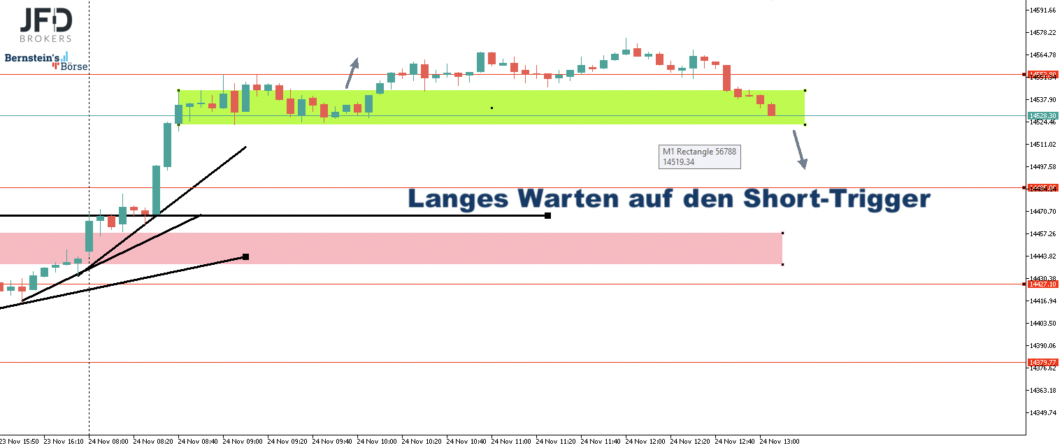 Vom Momentum getrieben und ohne größere Orders auf der Verkaufsseite manifestierte sich der DAX zunächst über 14.550 Punkten und zeigte dann erst am frühen Nachmittag das Short-Signal, auf welches wir lange warteten: