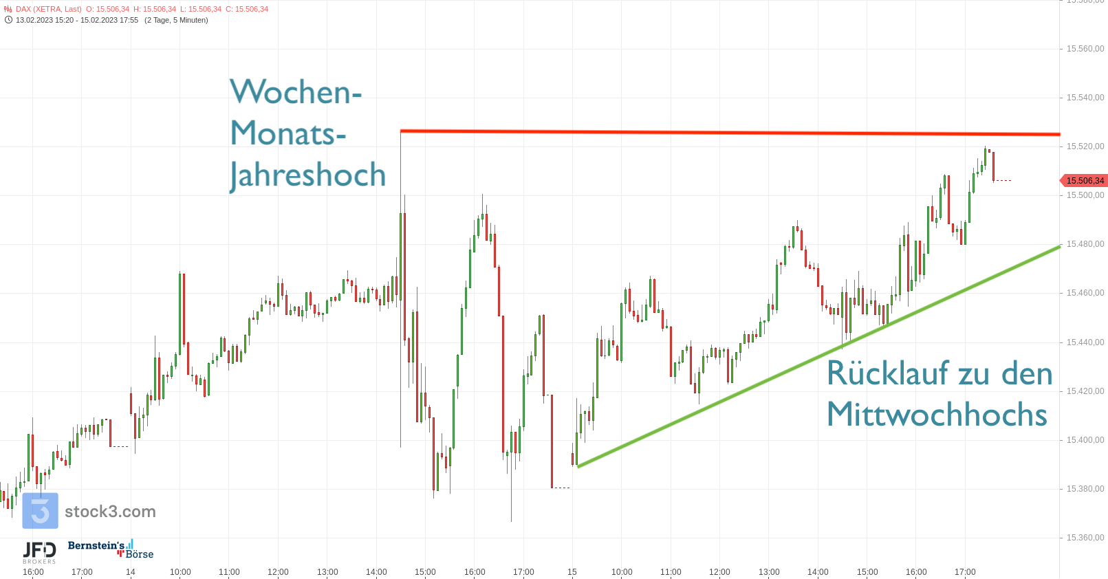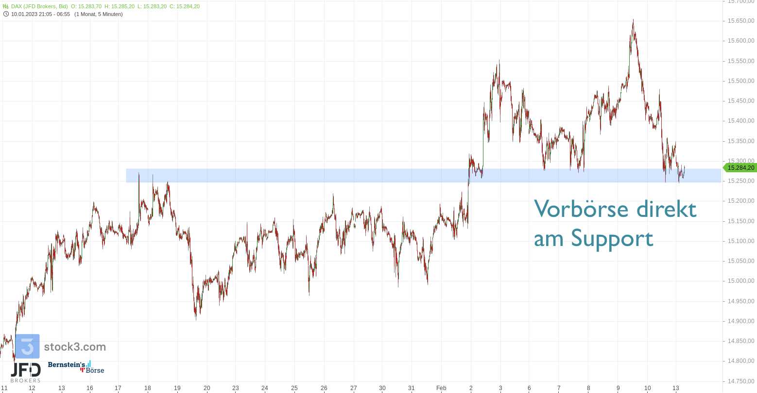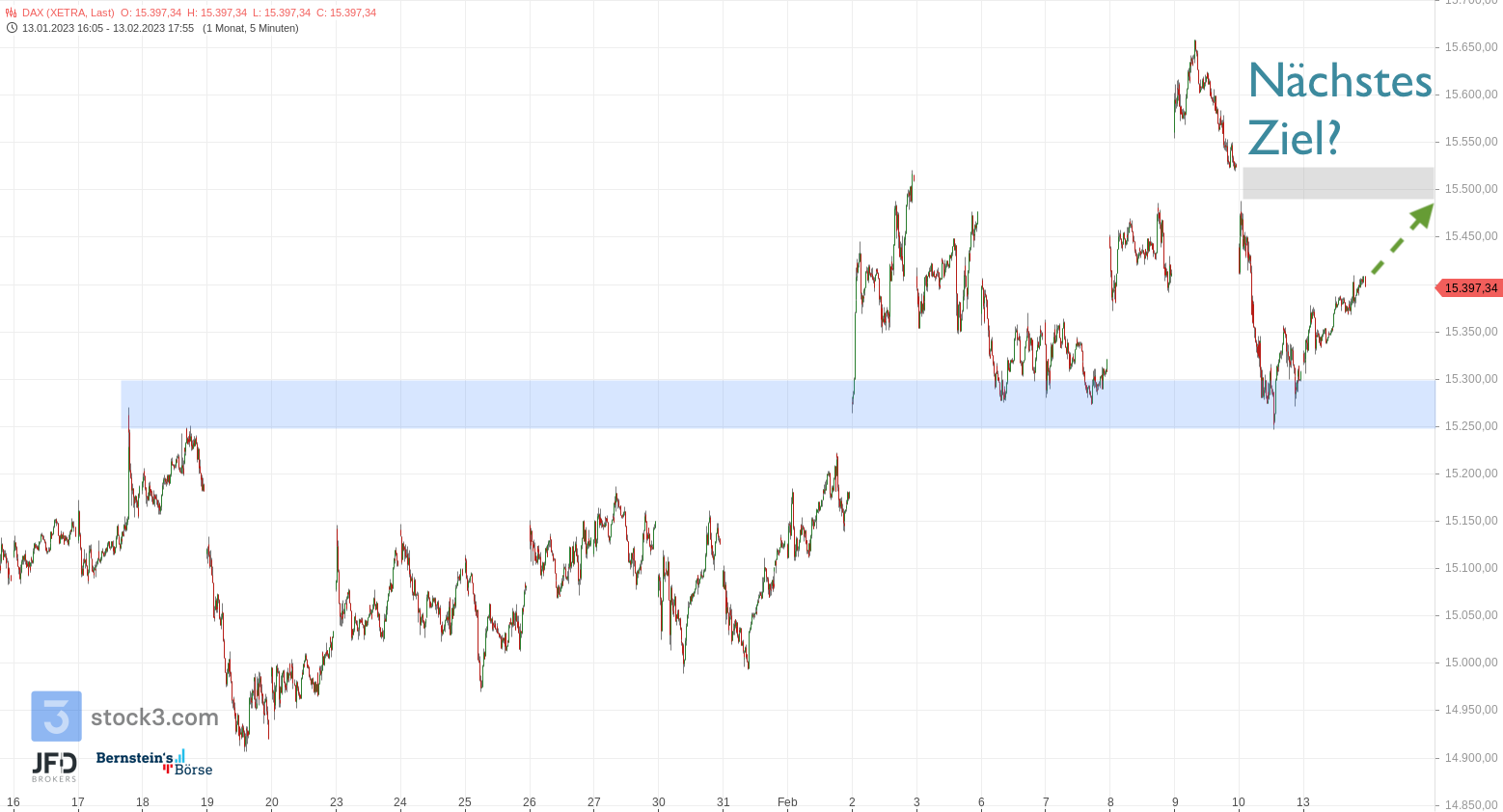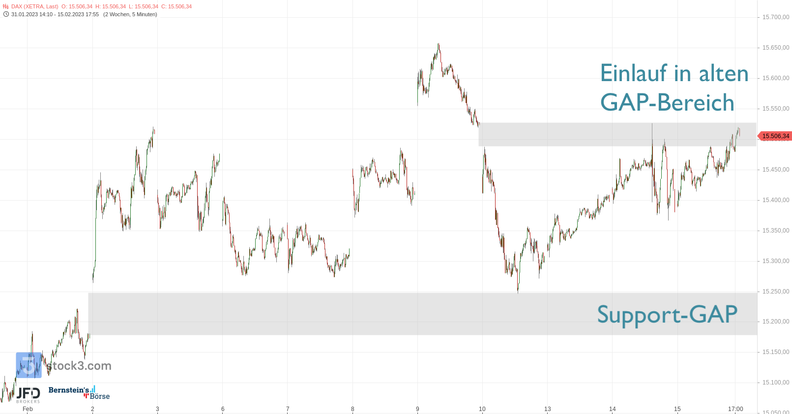 Vom Bereich der größeren Unterstützung haben wir uns im DAX nun wieder deutlich entfernt. In der ersten Morgenanalyse dieser Woche vom 13.02.2023 hatten wir auf das Niveau um 15.300 wie folgt gebaut: