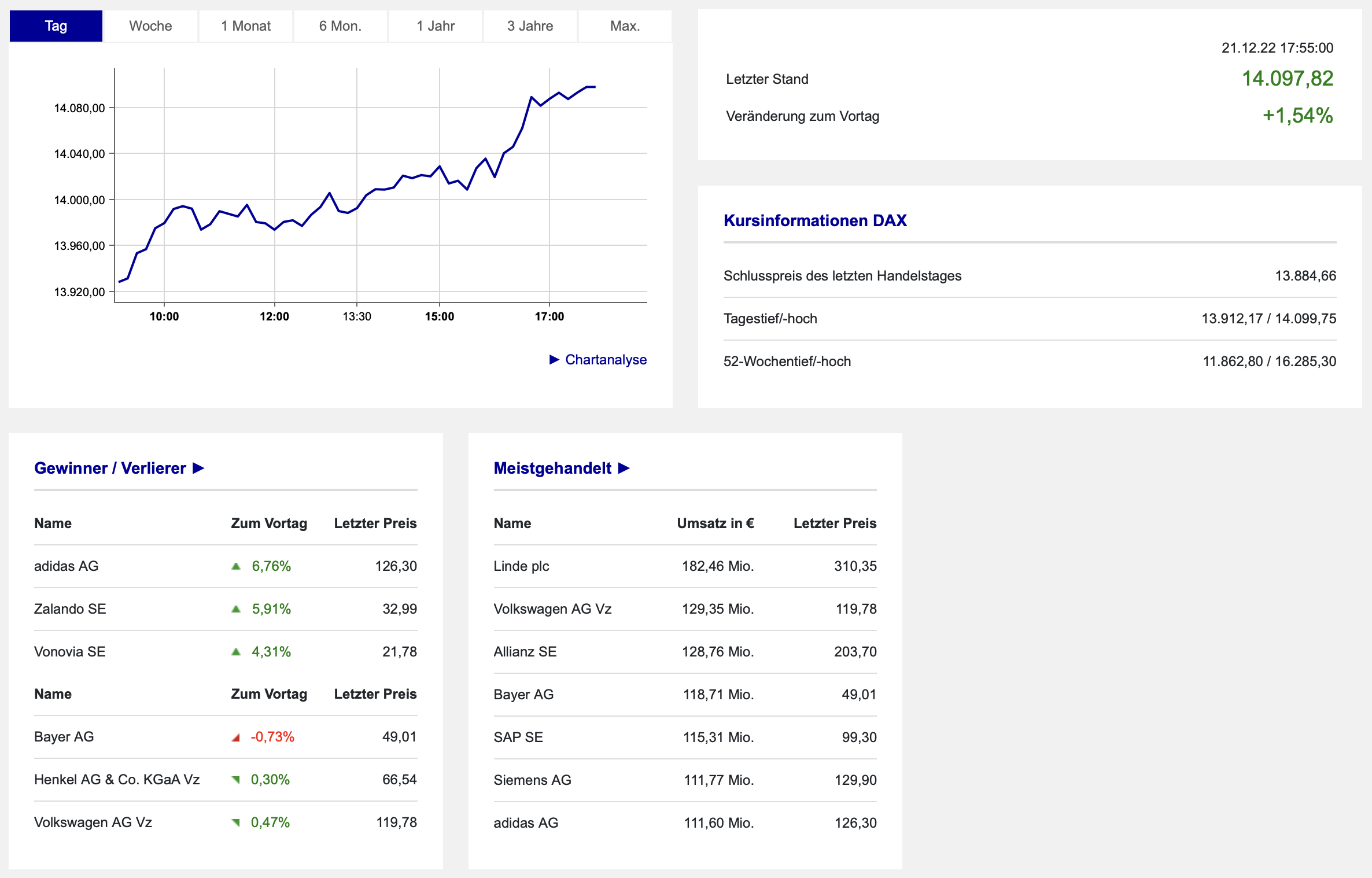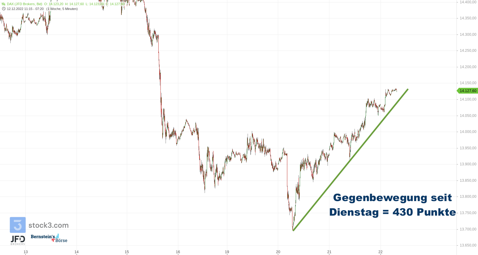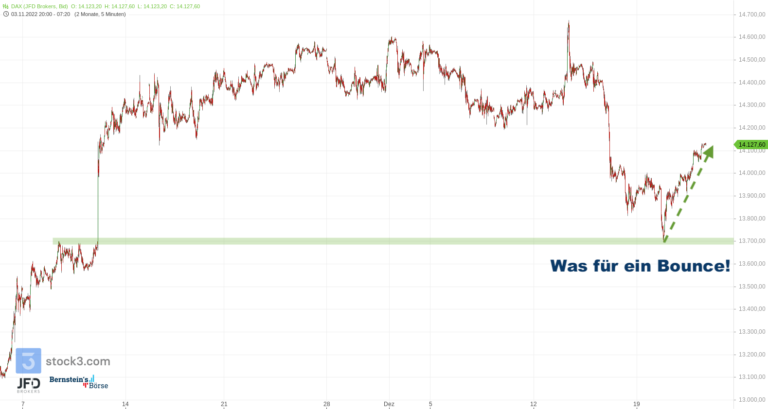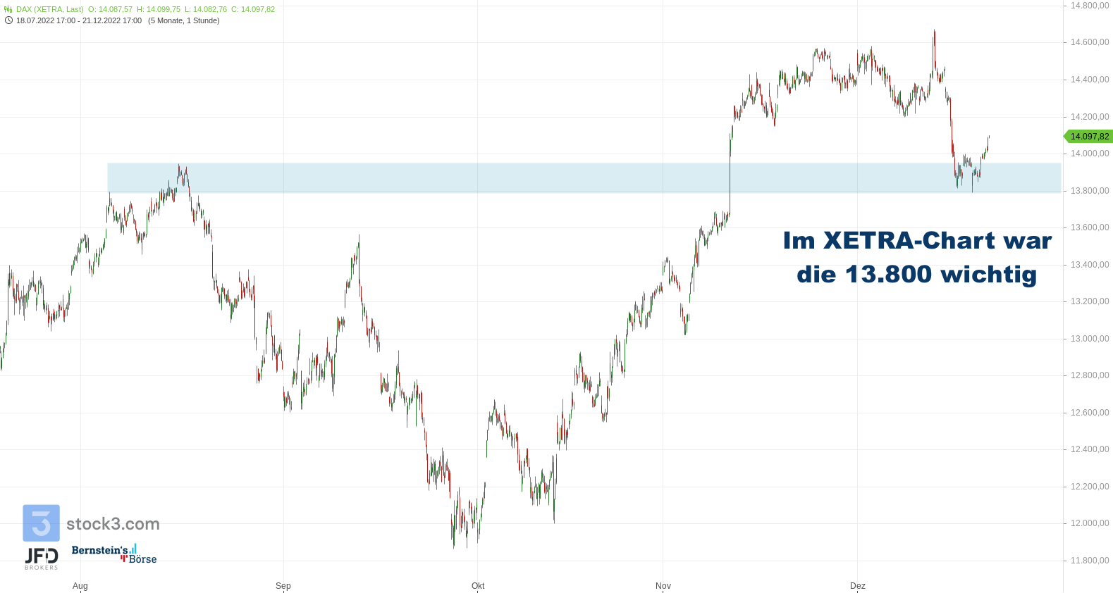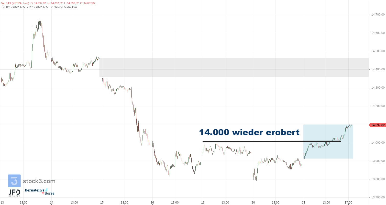 Das Monatstief im DAX war für eine starke Umkehr gut, kann man zumindest im Nachgang attestieren. Die Oberseite wird daher nun wieder spannender. Gestern sprachen wir in der Morgenanalyse am 21.12.2022 auch schon über die Relevanz der 14.000er-Region und Psycho-Marke, wie dieser Rückblick aufzeigt: