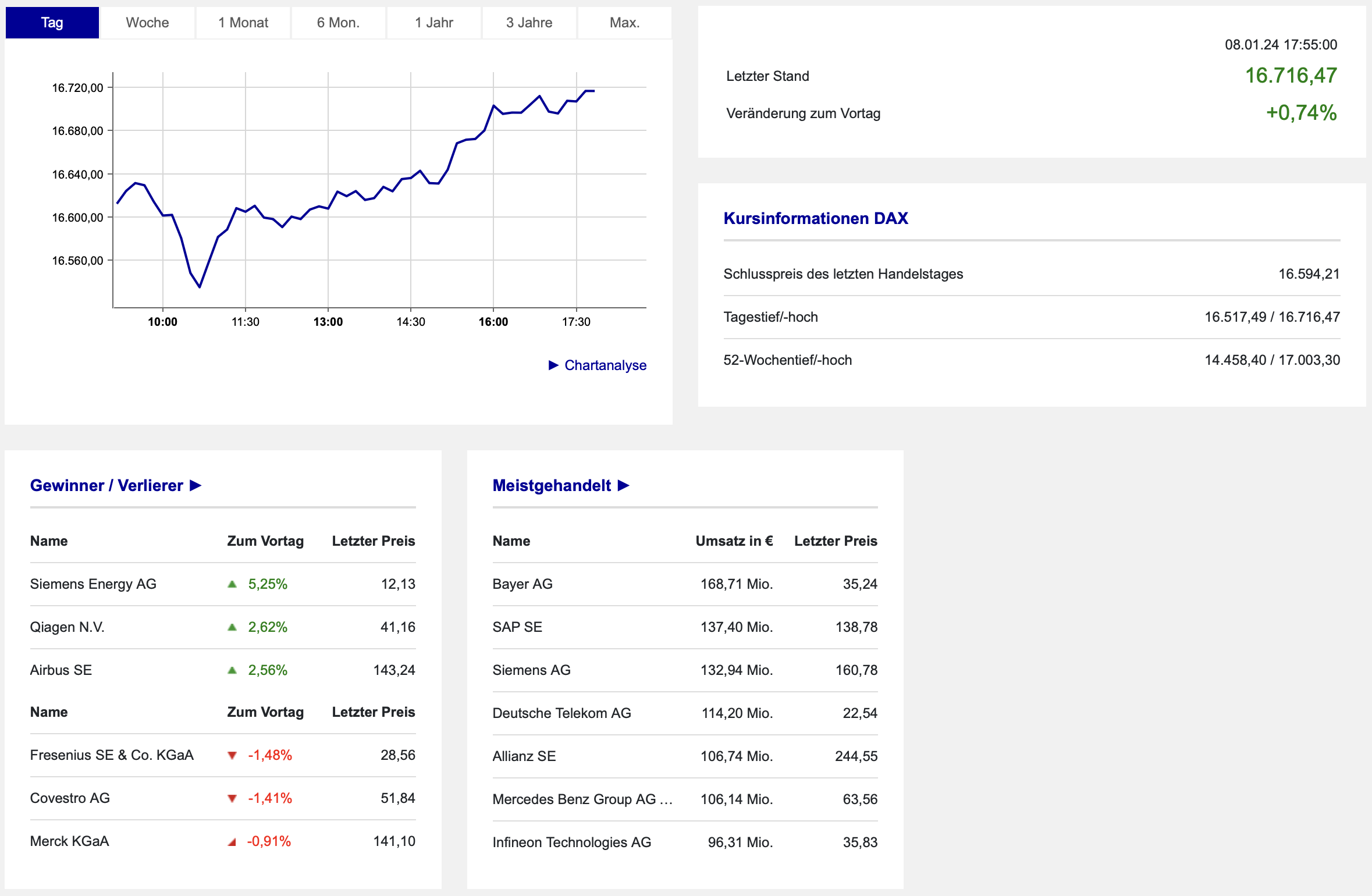 Mit dem Schlusskurs an der Börse Frankfurt ist damit die 16.600 per Schlusskurs überschritten und sogar die 16.700 rückerobert worden. Ein Kursplus von 0,74 Prozent bescheinigte somit einen positiven Wochenauftakt: