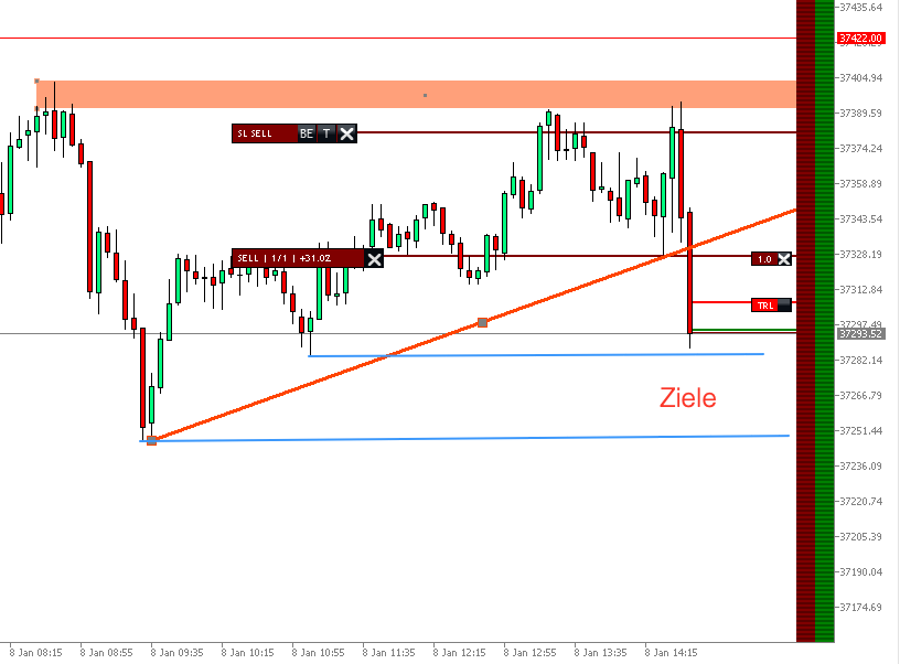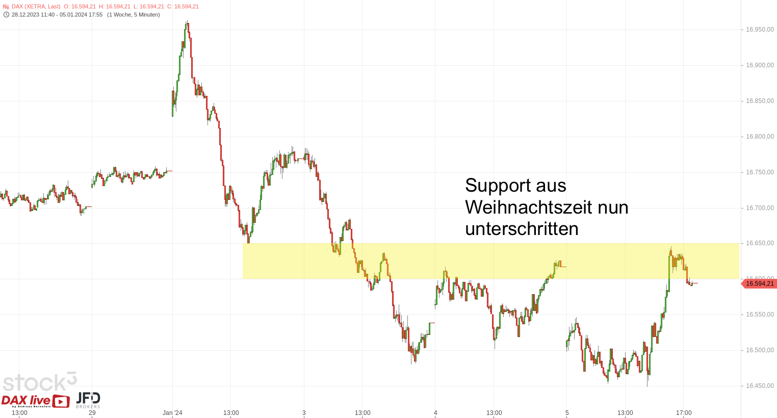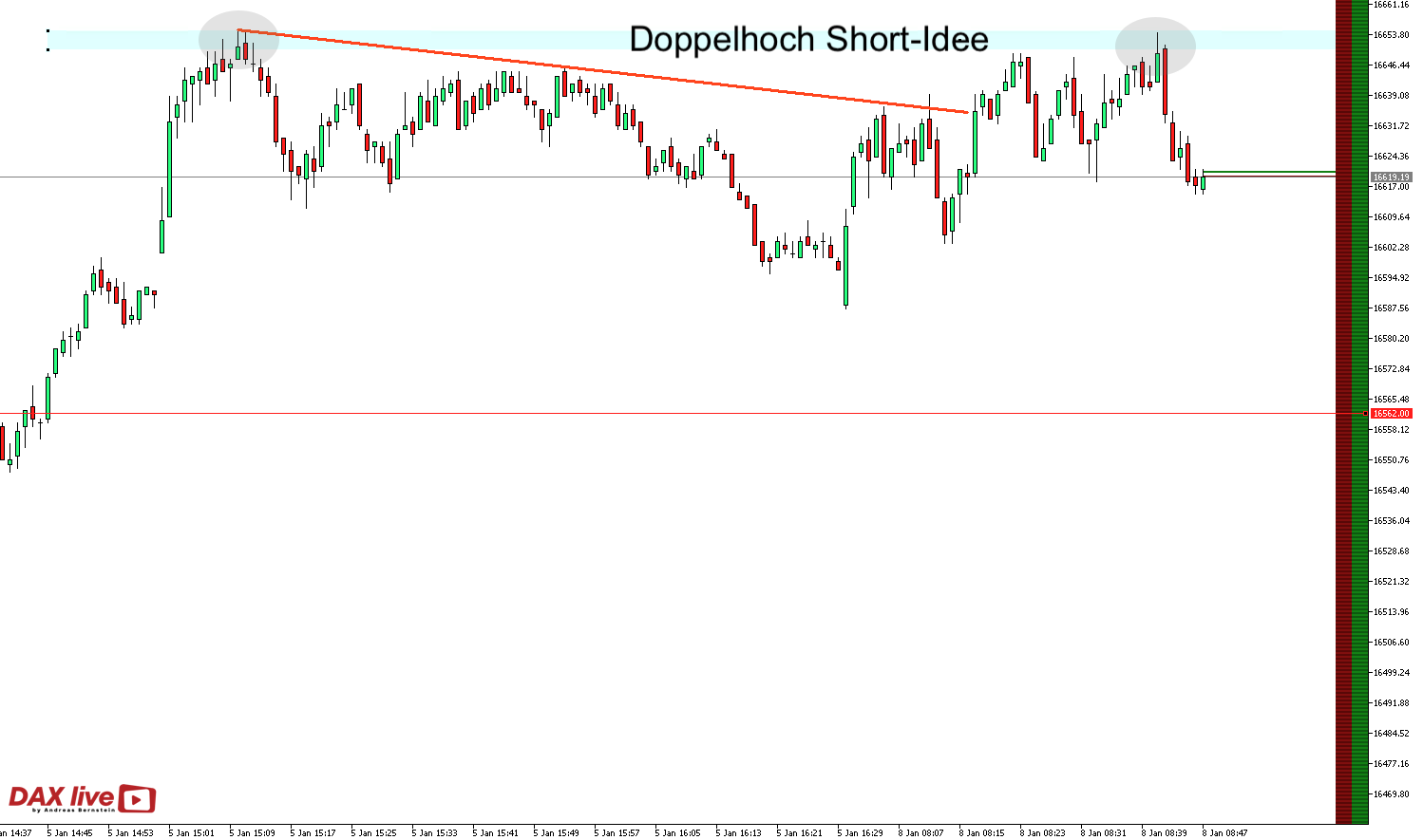 Mit diesen Voraussetzungen konnte das Freitagshoch als erster Widerstand definiert werden und wurde bei DAX live entsprechend als potenziellen Short-Einstieg besprochen: