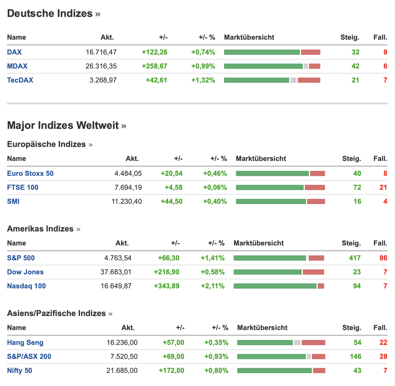 Dies war ein Aufschwung von mehr als 2 Prozent und eine regelrechte Short-Eindeckung am Markt. In Summe gab es dann für alle US-Indizes ein deutliches Plus. Alle Schlusskurse sind im Detail noch einmal hier aufgeführt: