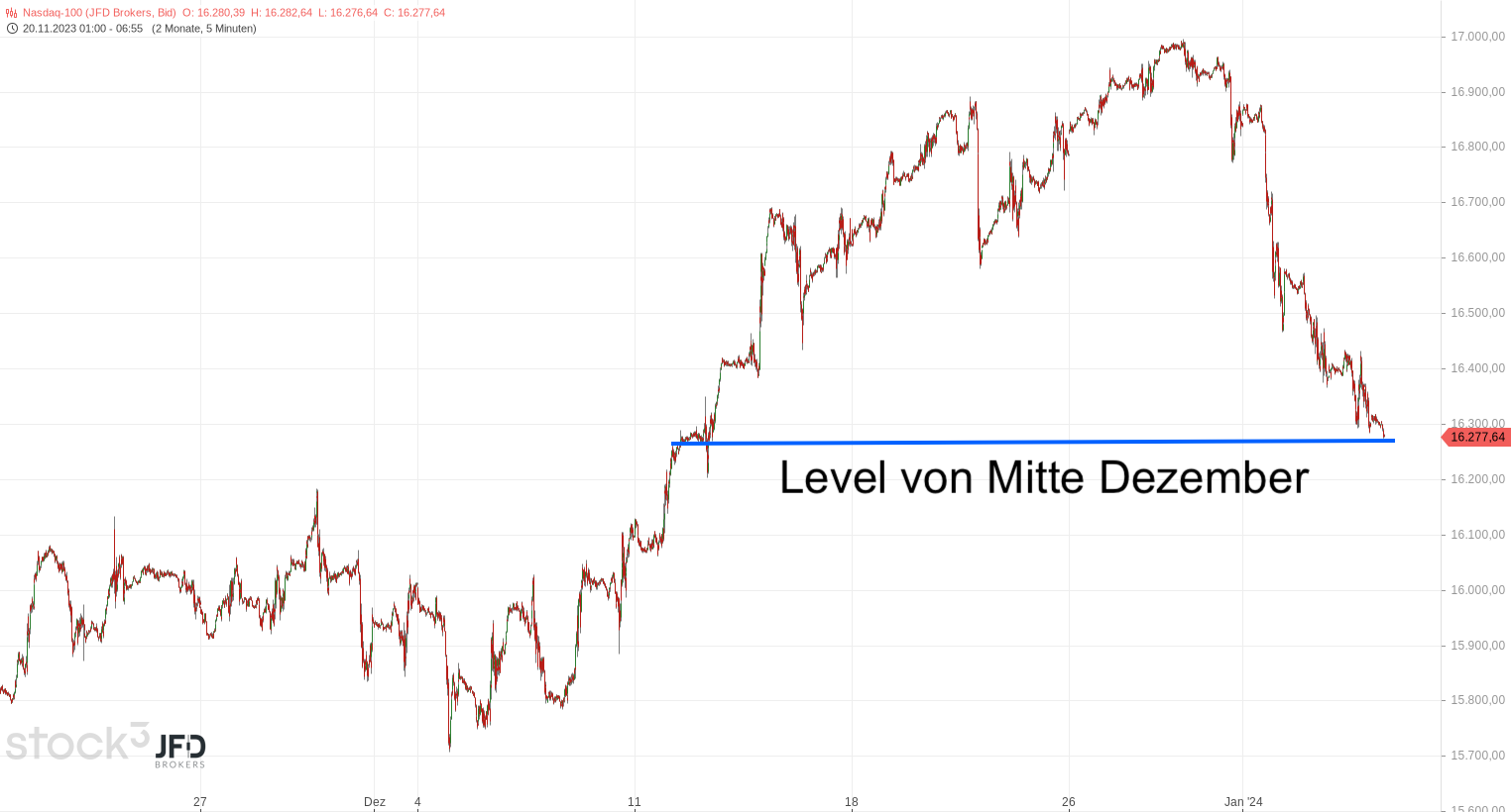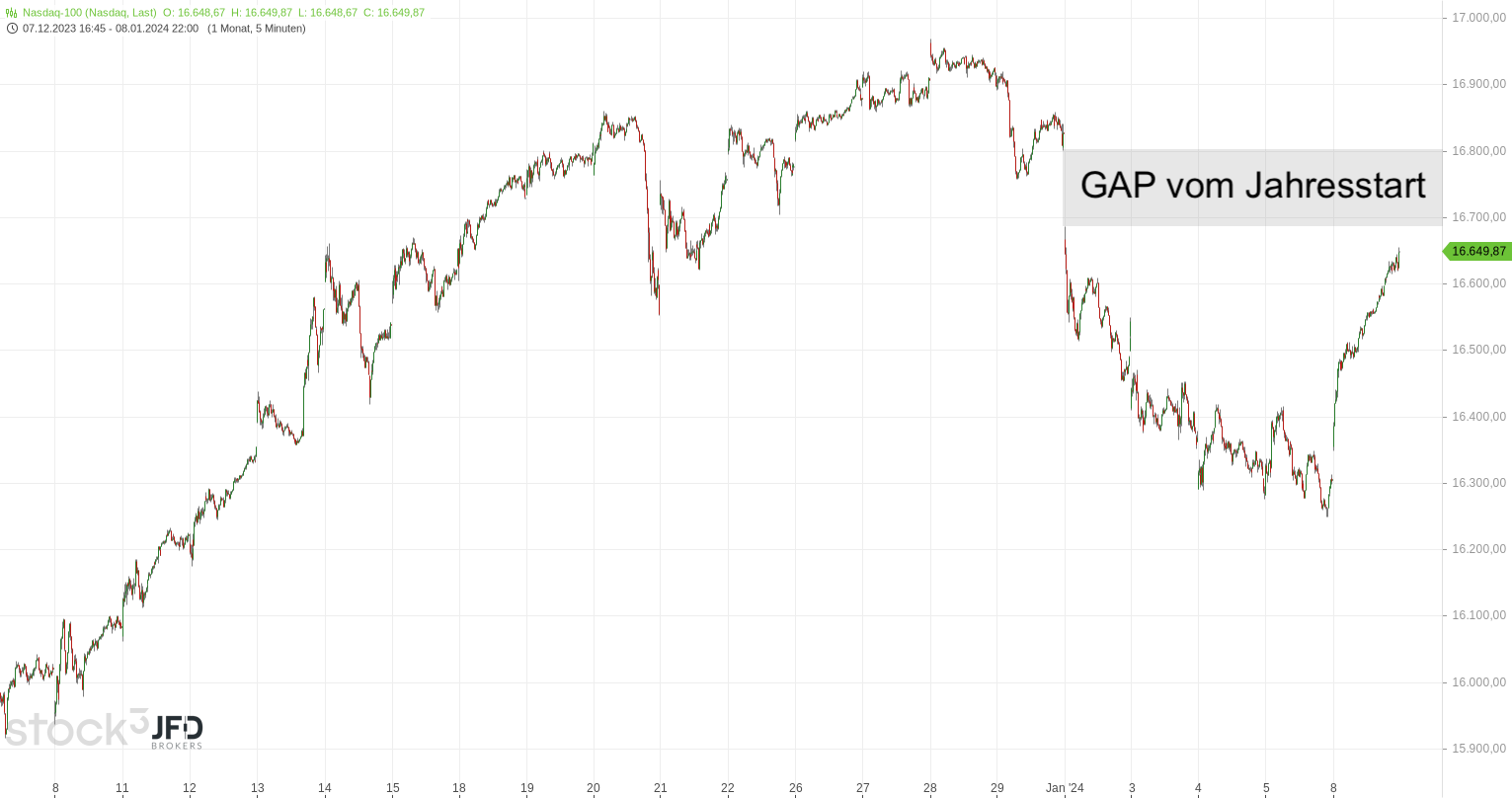 Das Sentiment drehte später, angefacht von starken Technologiewerten. Zuvor gab es im Nasdaq nur Minustage im neuen Jahr. Dabei wurde schon am Donnerstag das Level aus Mitte Dezember erreicht (Rückblick):