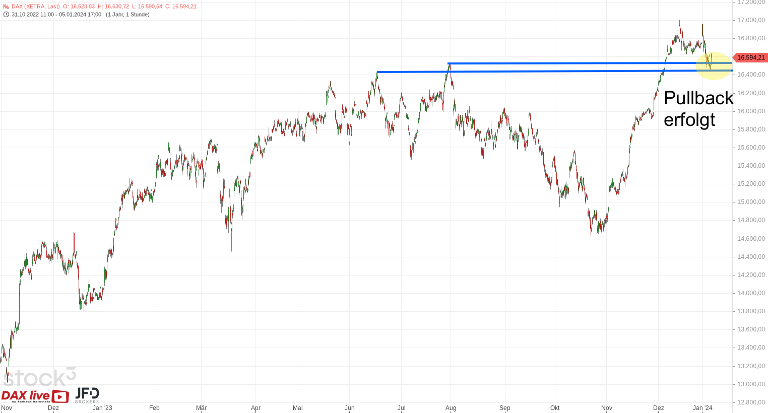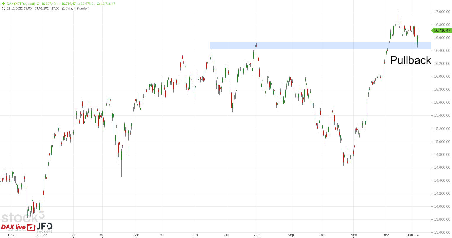 Wir haben auch in dieser Woche die erhöhte Volatilität an den Aktienmärkten gesehen, die für das Trading eine maßgebliche Komponente darstellt. Zunächst startete der DAX mit einem starken Freitagabend an den Widerstandspunkten der Vorwoche, die im Dezember noch Unterstützung boten. Mit diesem Chartbild hatten wir in der Morgenanalyse am 08.01.2024 bereits die erste Stabilisierung aufgezeigt und als Orientierung genutzt (Rückblick):