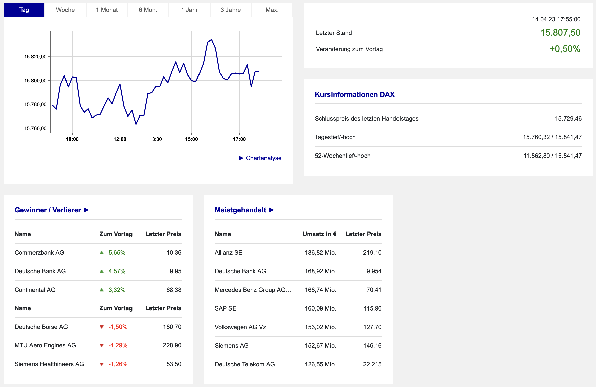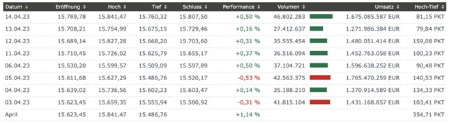 Dabei stand der DAX weitaus stärker im Interesse der Anleger:innen als die Wall Street selbst, die mit der Quartalssaison startete und weitere Inflationsdaten veröffentlichte. Darauf gingen wir in der Sonntagsanalyse am 16.04.2023ausführlicher ein. Die Übersicht der Rankings bezogen auf die Handelswoche und die Indizes siehst Du hier: