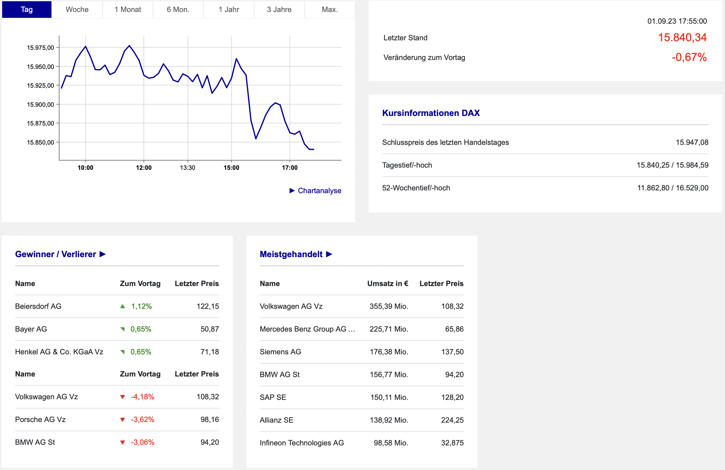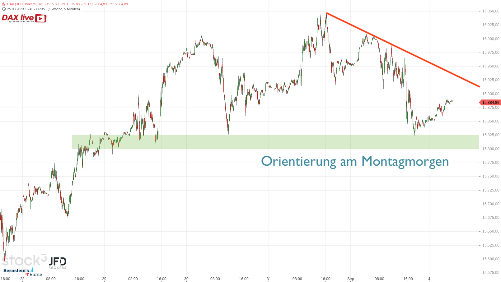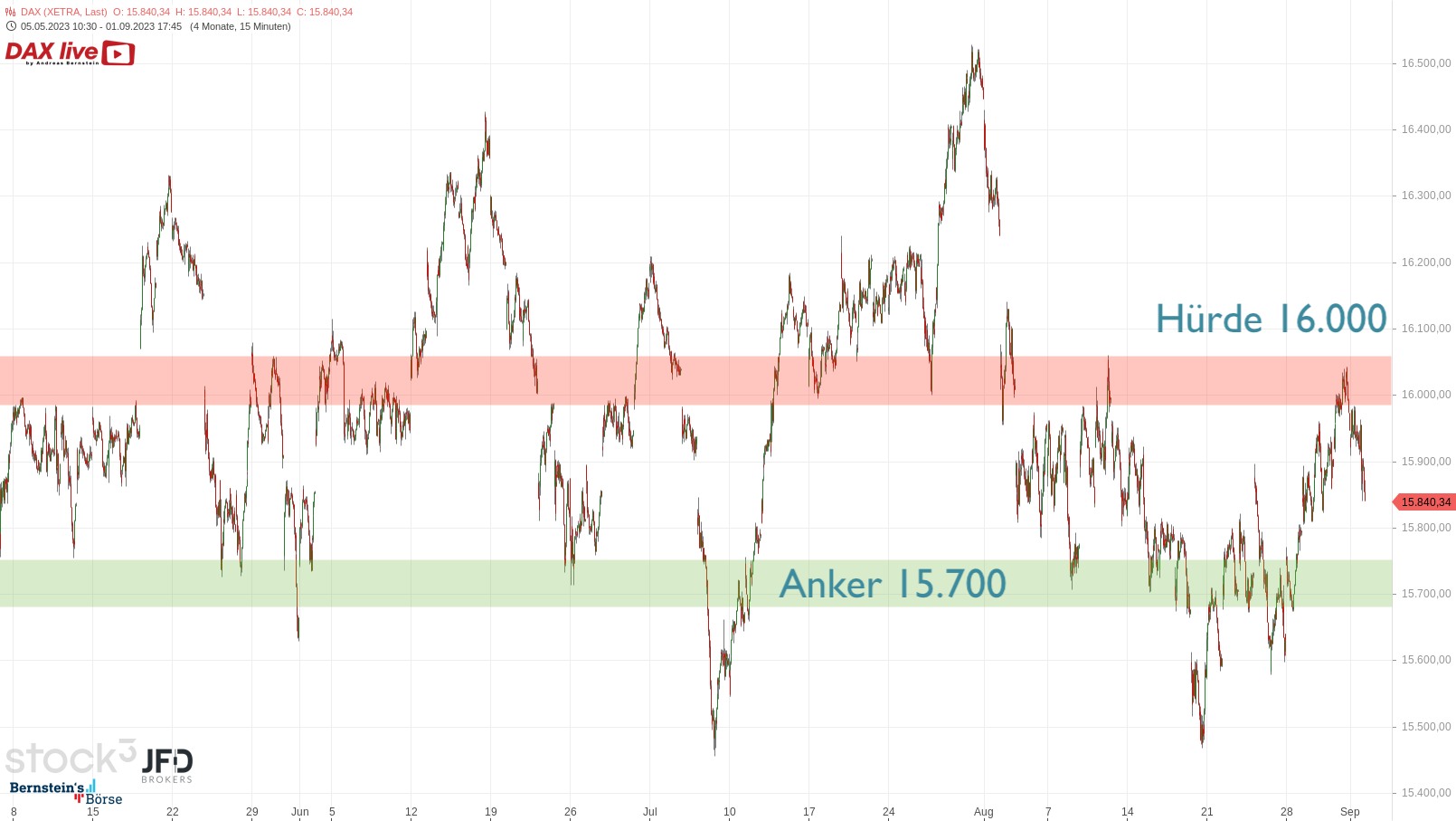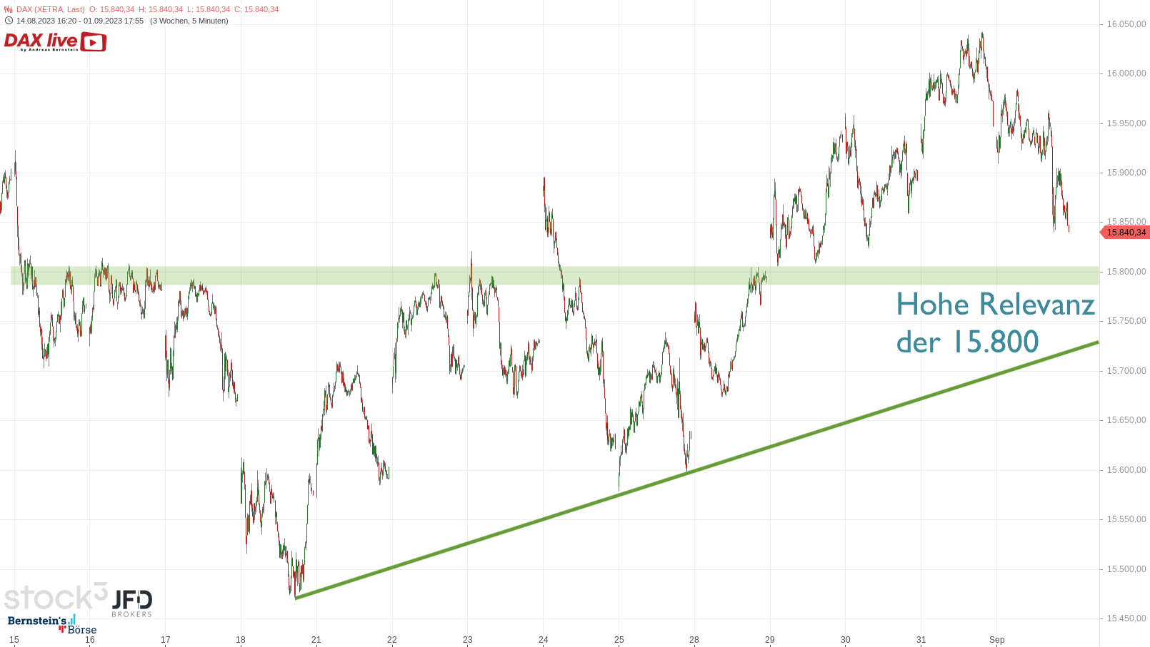 Die Relevanz der Trendlinie aus der Morgenanalyse vom 01.09.2023 und den darunter liegenden Bereich um 15.900 Punkte hatten wir entsprechend ausgewertet (Rückblick):