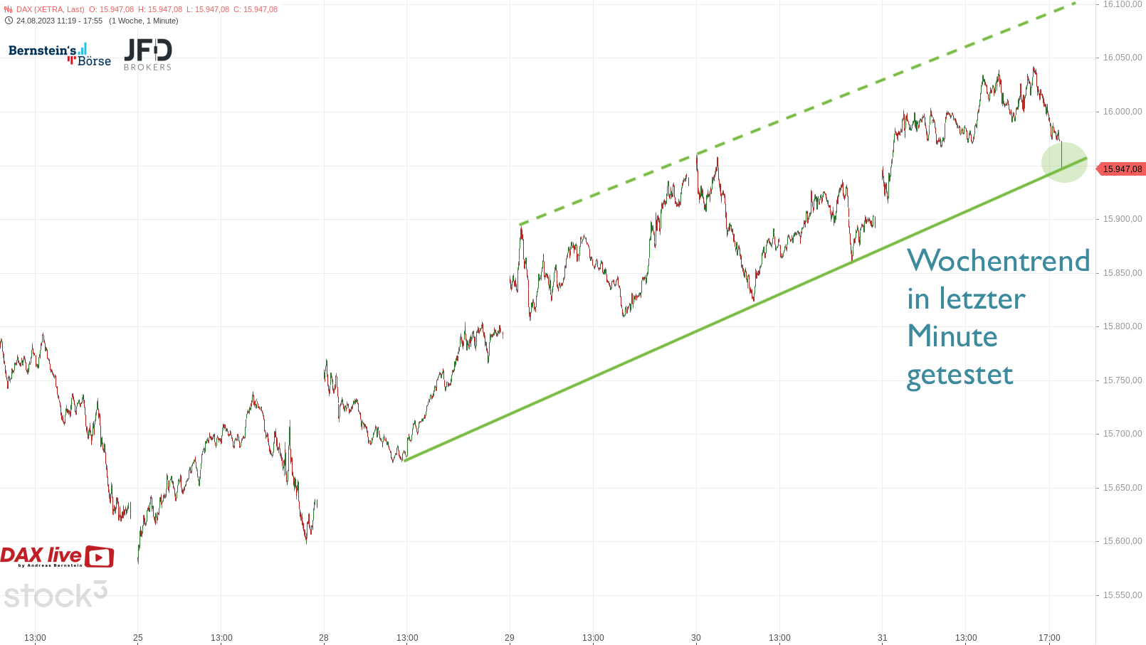 Die Trendlinie wurde bis zum Handelsende der Woche beibehalten und damit letztlich auch die 15.900 unterschritten. Genau dort stehen wir auch noch in der Vorbörse am Montag: