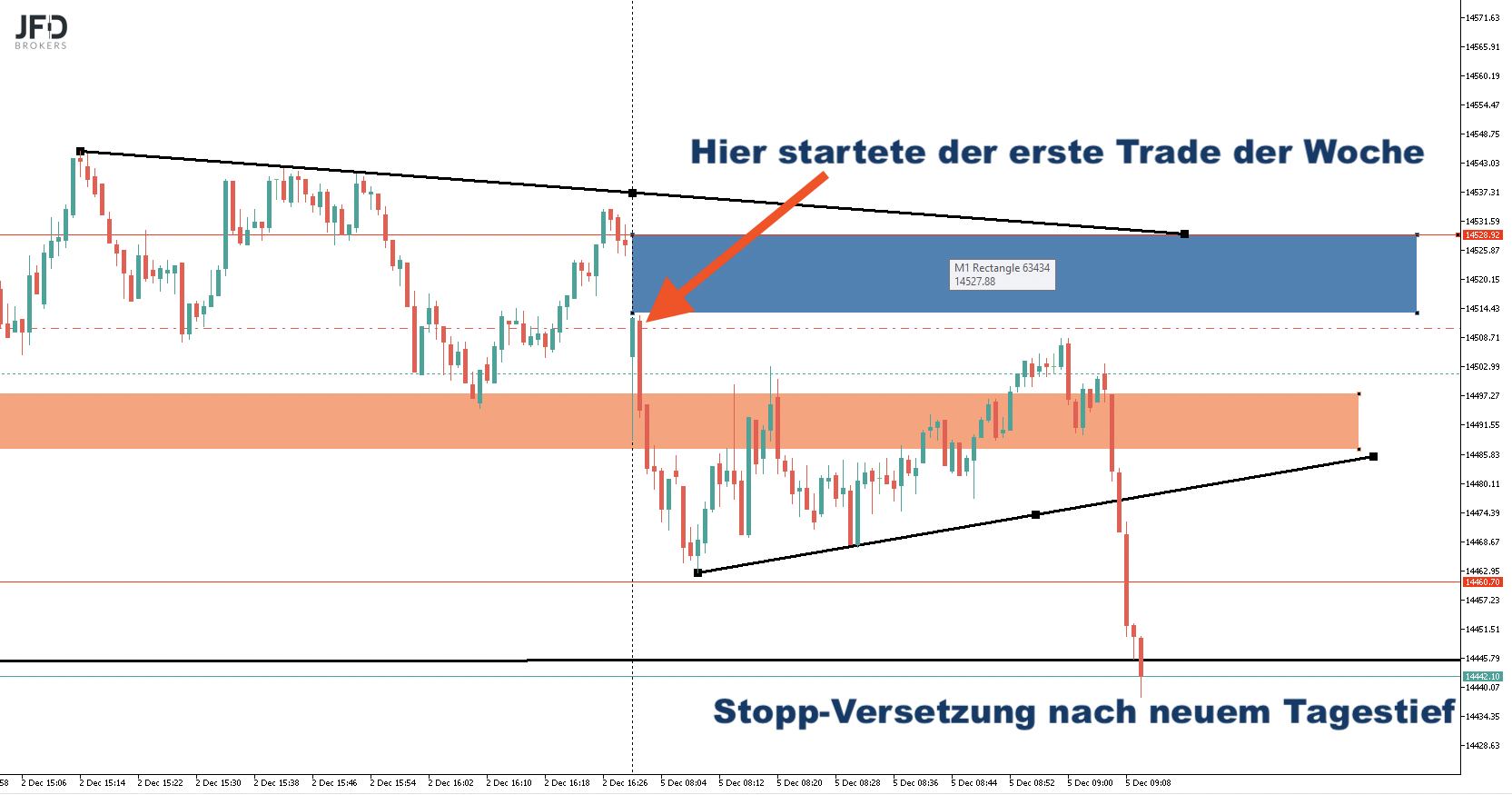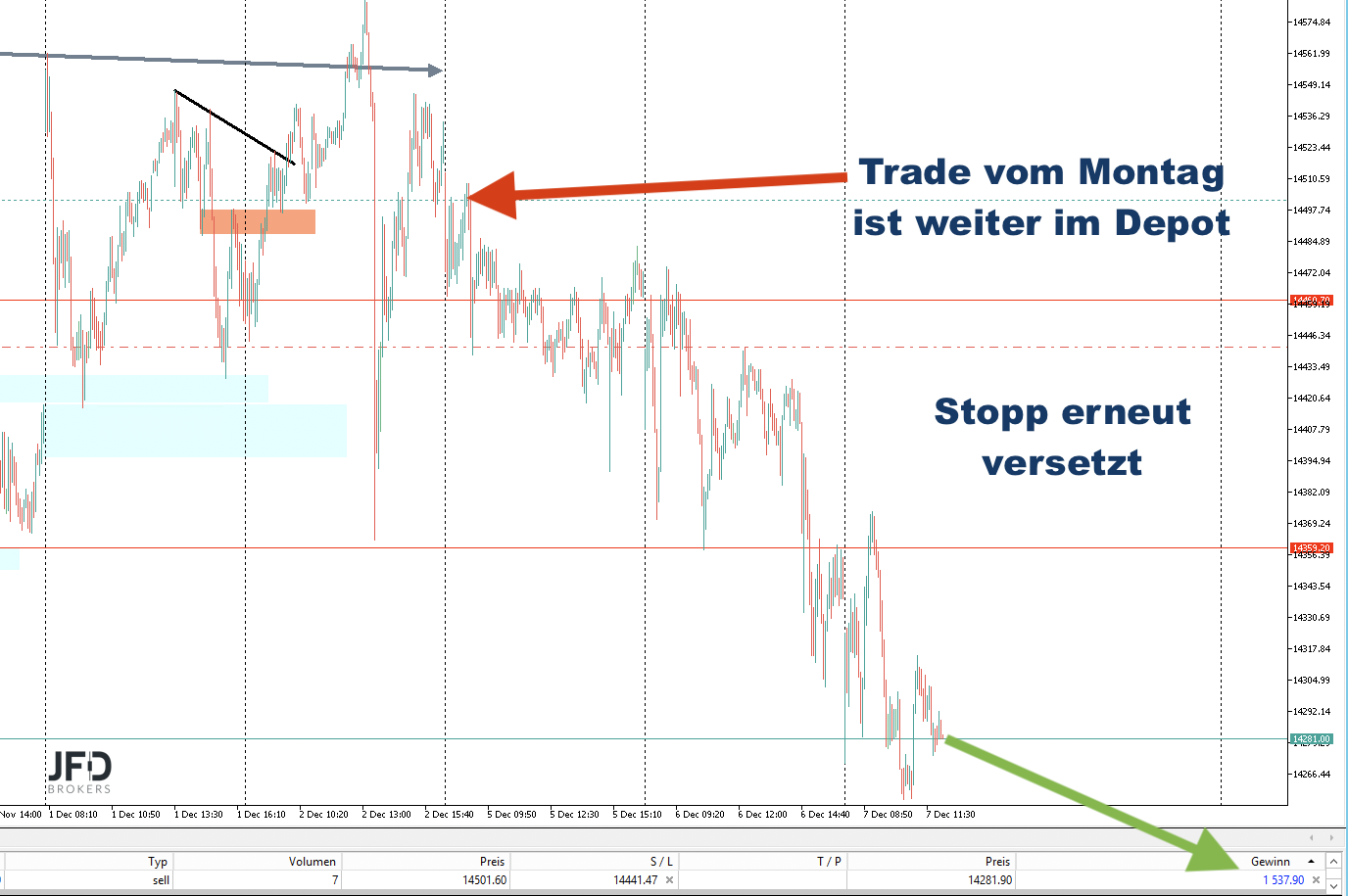 Kurioserweise hatte ich am Montag einen Short-Trade um 14.500 Punkte eröffnet und öffentlich gezeigt:
