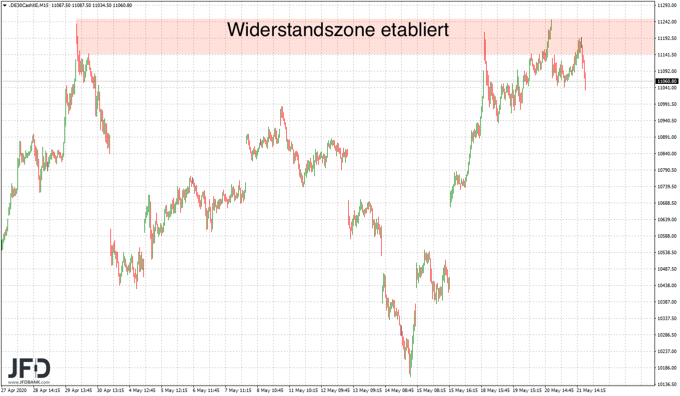 Hier gelang zum Vatertag somit ein erneutes Ansteuern aber kein Bruch. Damit hat sich der Widerstand weiter verfestigt. Zum Handelsende wurden alle Gewinne abgegeben, doch der Widerstand ist klar im Chartbild verankert: