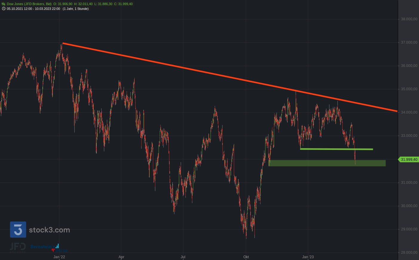Für den Dow Jones skizziert sich die Lage ähnlich. Auch dort gab es einen Bruch einer Unterstützung und damit auch den Ausbruch aus der großen Seitwärtsrange, die wir in der Vorwochenanalyse am 05.03.2023 skizziert hatten: