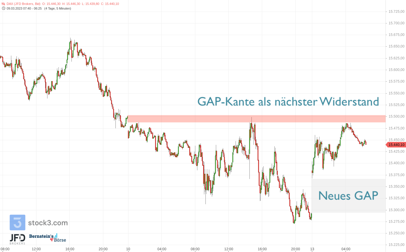 Das Momentum von dieser Meldung aus den USA ausgehend kann den DAX nun bis zur 15.500er-Schwelle technisch tragen. Dort sollten sich die Marktteilnehmer aus meiner Sicht neu orientieren. Von daher ist dies für mich der erste Widerstand des Tages: