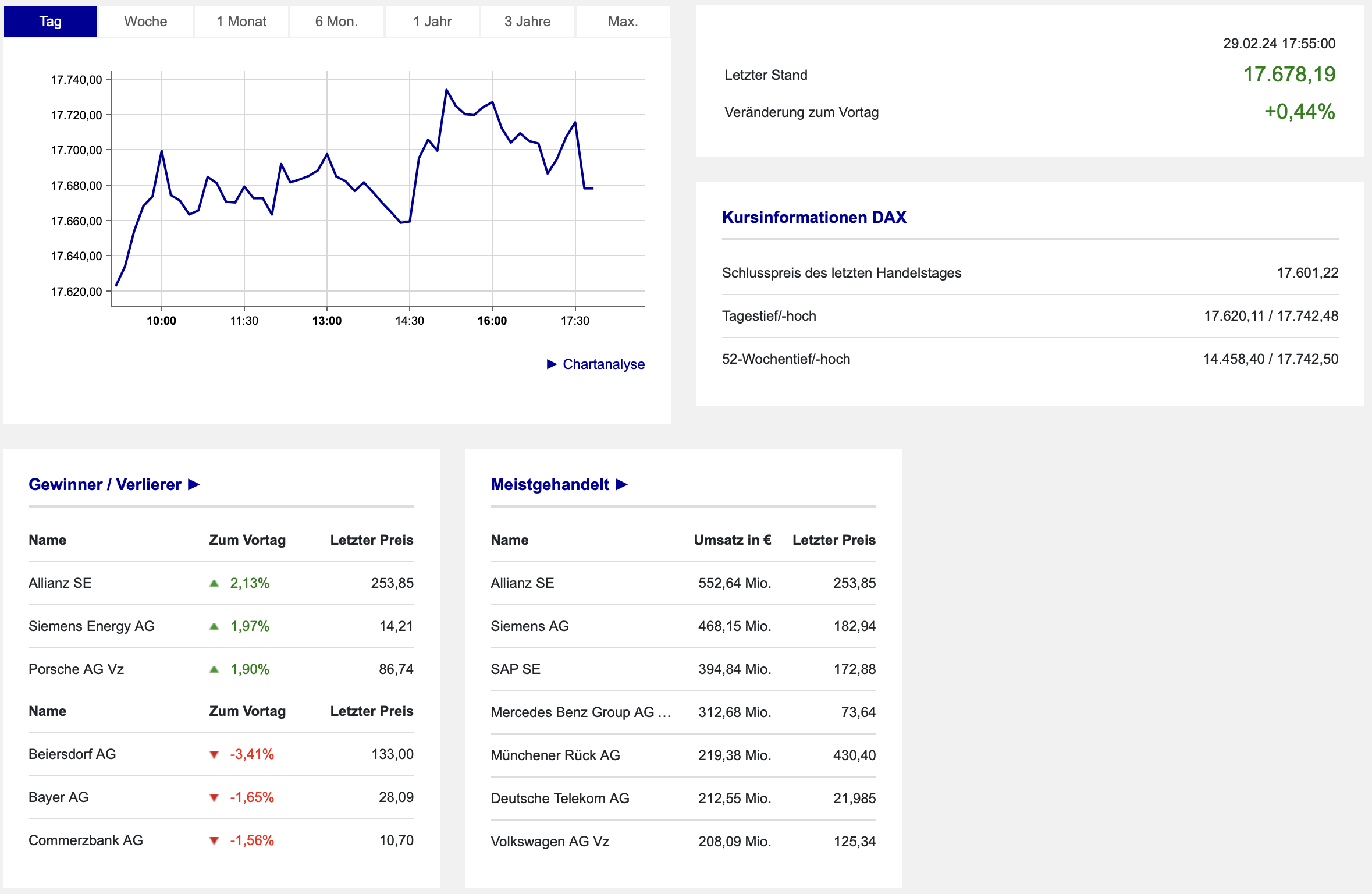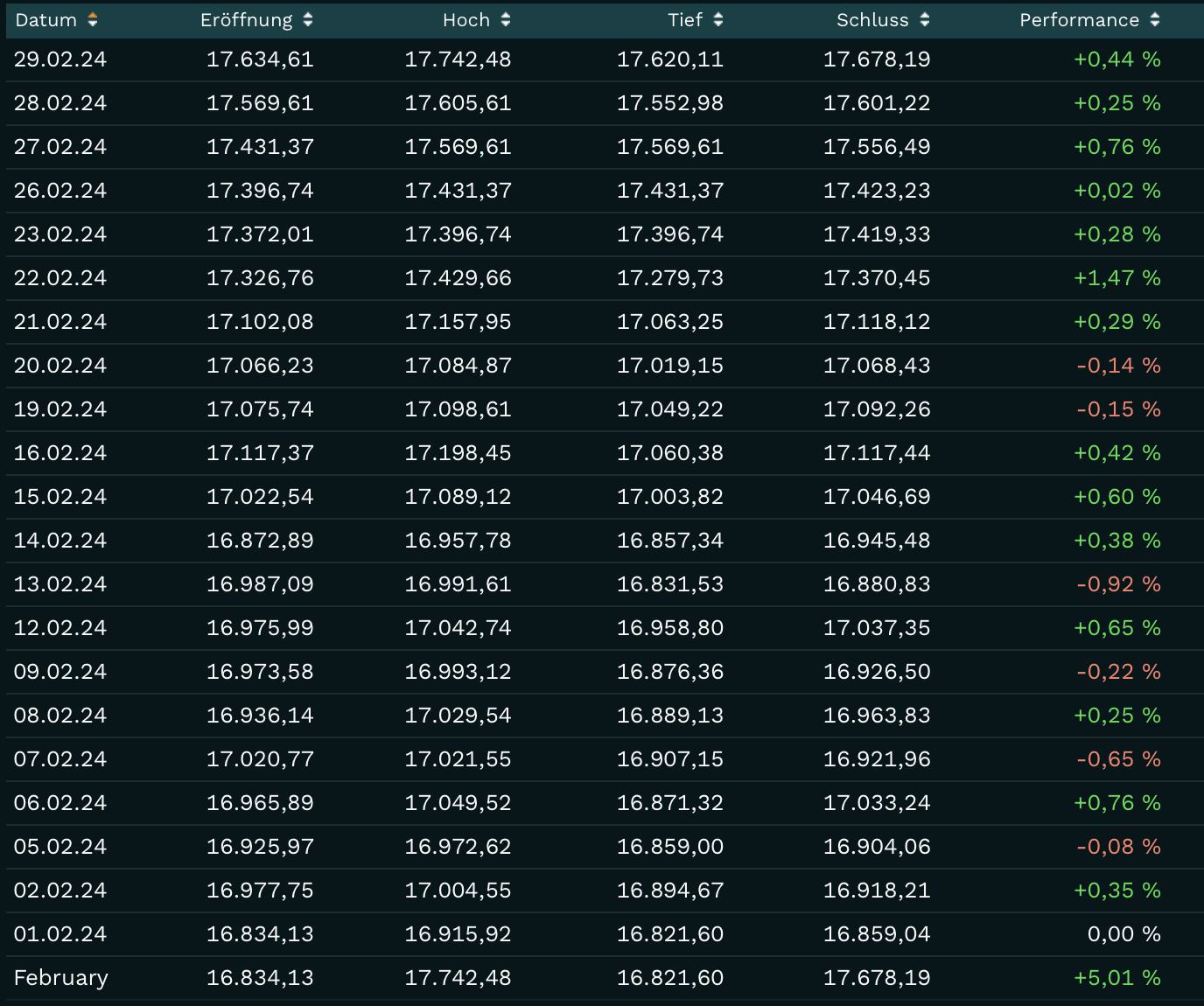 Auch die US-Daten vom Nachmittag brachten keine Schwäche in den Markt. Wir sahen daher erneut einen Plustag und damit den höchsten Schlusskurs in der DAX-Historie. Die Daten der Börse Frankfurt sind hier verankert: