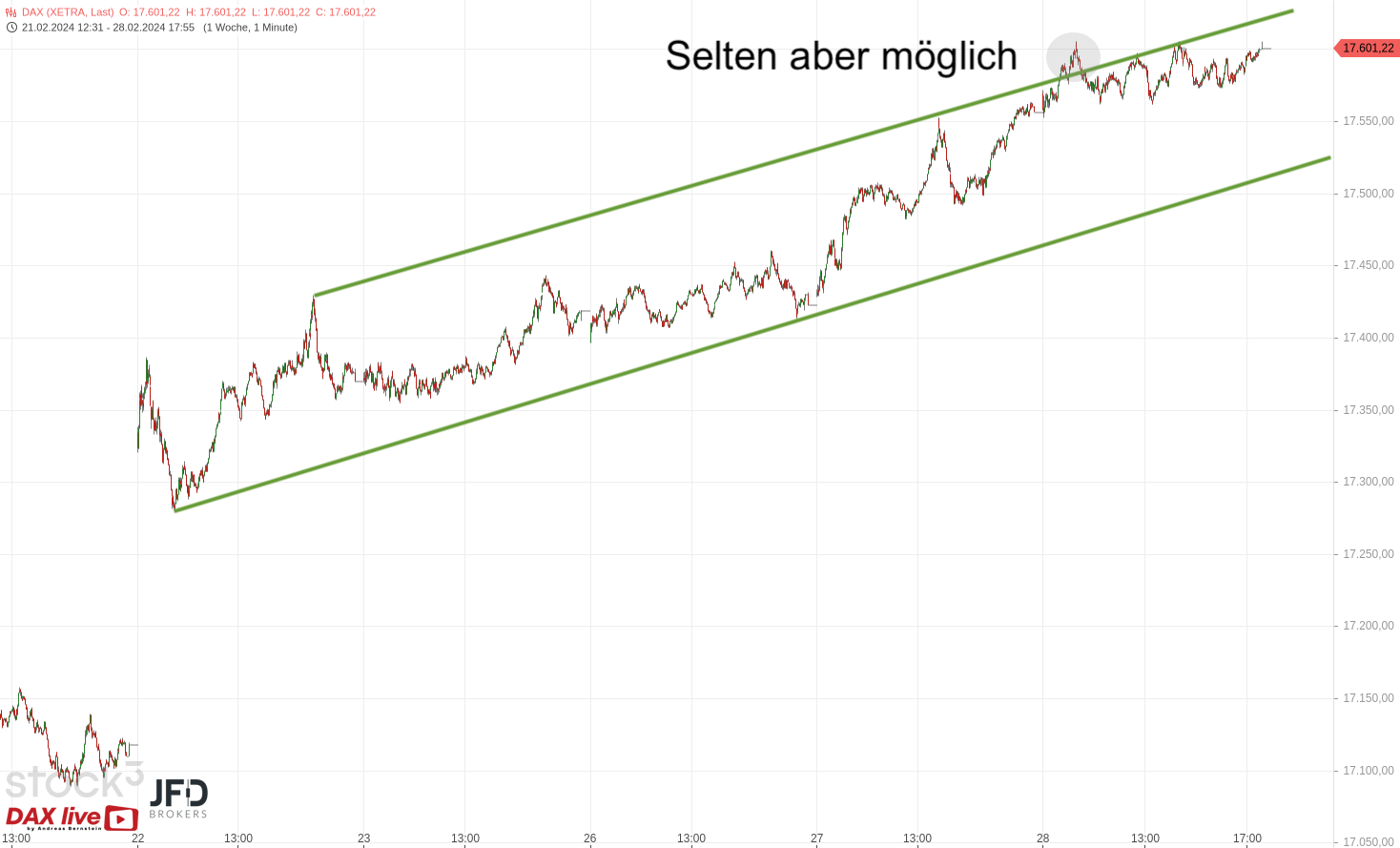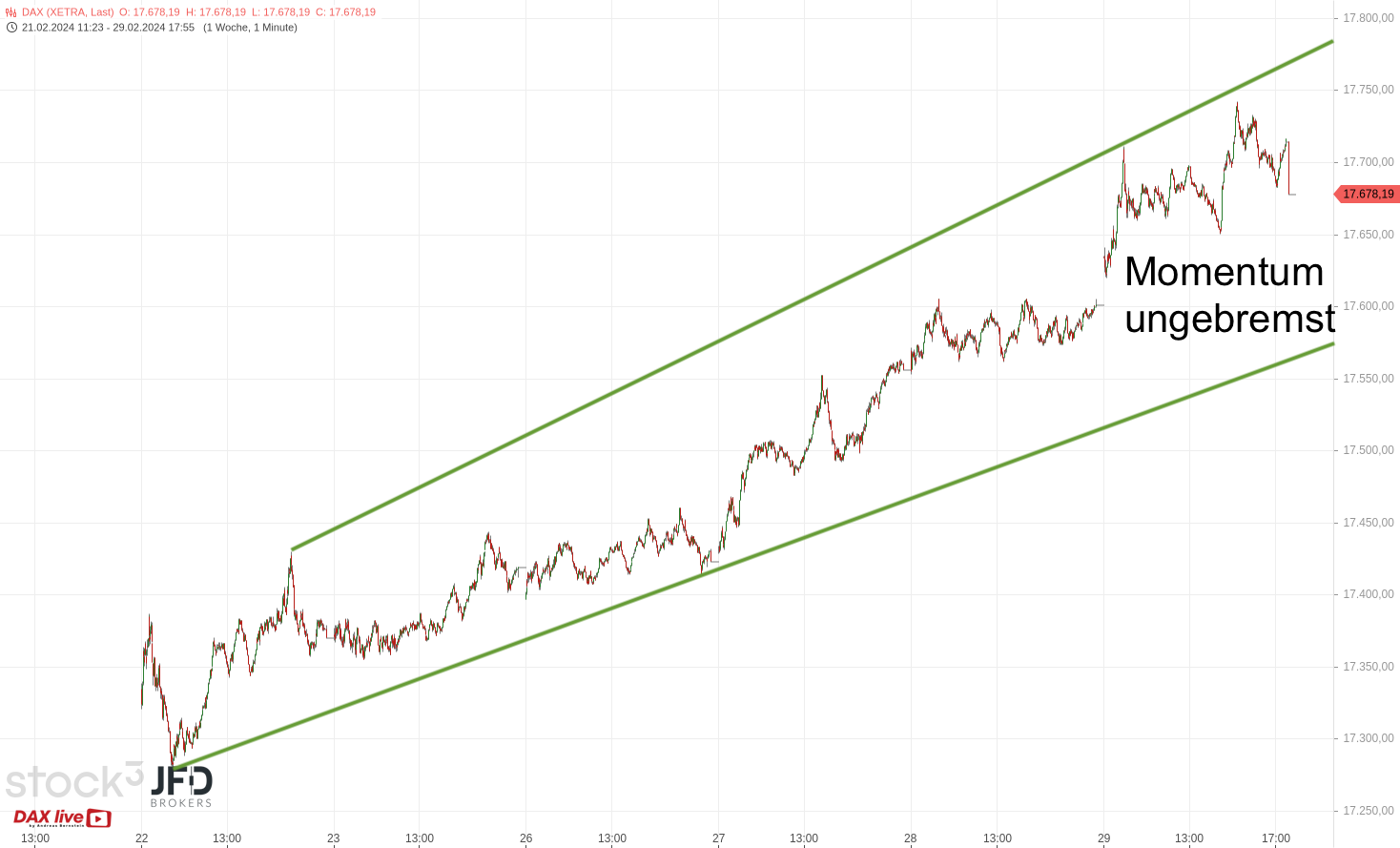 Dabei stand die nächste runde 100er-Marke bereits Mittag auf der Agenda. Sie passt in das Gesamtbild, welches bis zum Abend positive Ausstrahlung zeigte. Der Trendkanal muss entsprechend erweitert werden, um das Momentum optisch einzufangen: