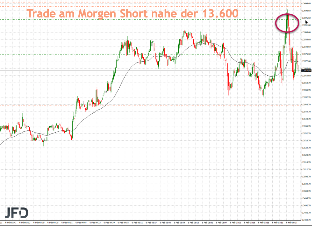 So geschehen auch gestern, als ich den Bereich um 13.600 als Widerstand identifizierte (Freitagshoch vor einer Woche) und in dieser Region ein kurzfristiges Short-Setup umsetzte: