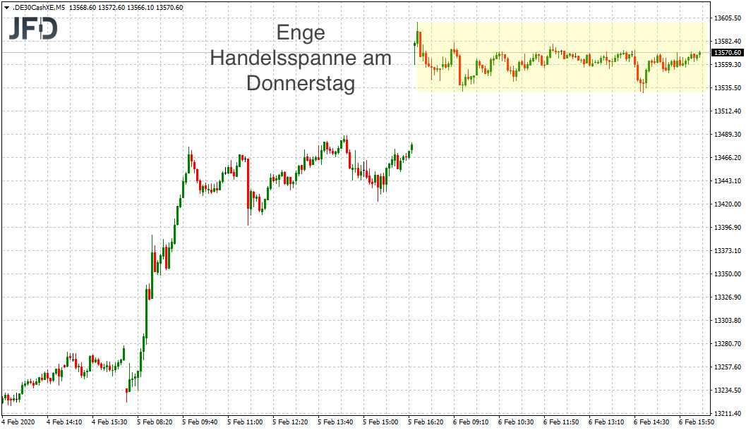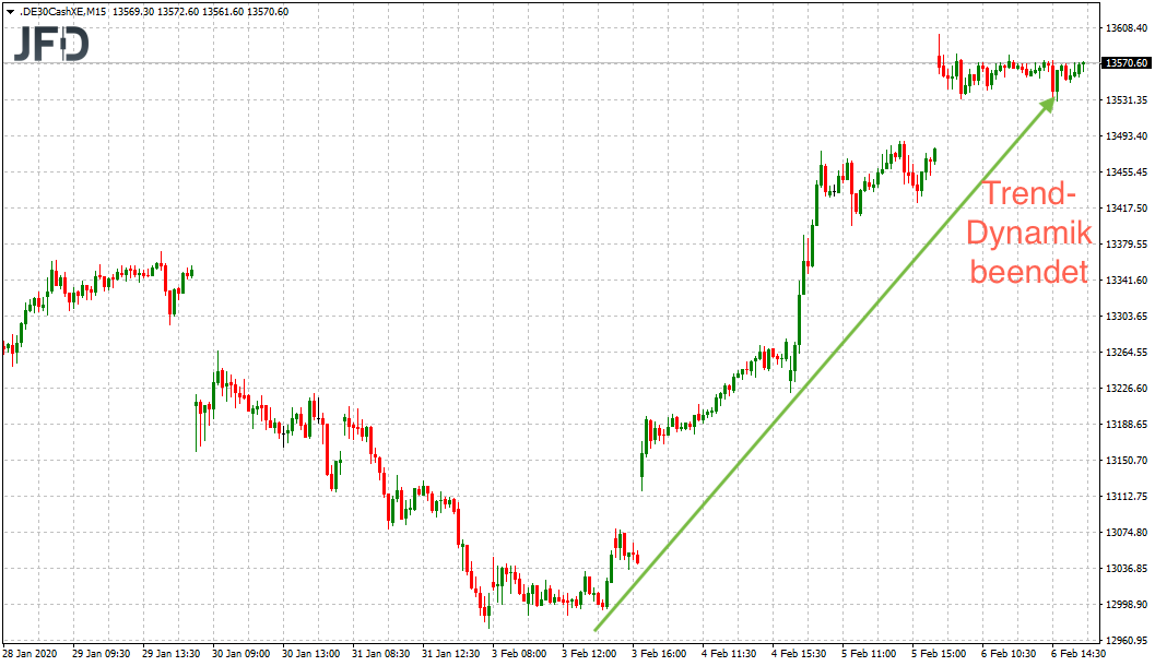 Nach der starken Eröffnung und zwischenzeitlichen Kursen von 13.600 Punkten scheint die Kraft nun erst einmal ausgereizt. Immerhin sind dies mehr als 600 Punkte Anstieg in dieser Woche oder knapp 5 Prozent im populärsten Deutschen Aktienindex.