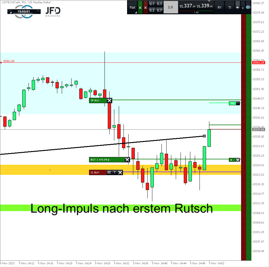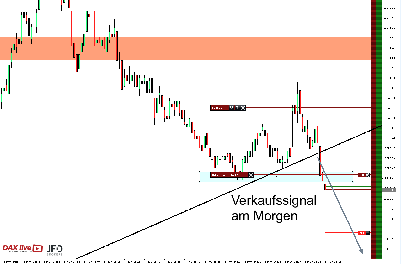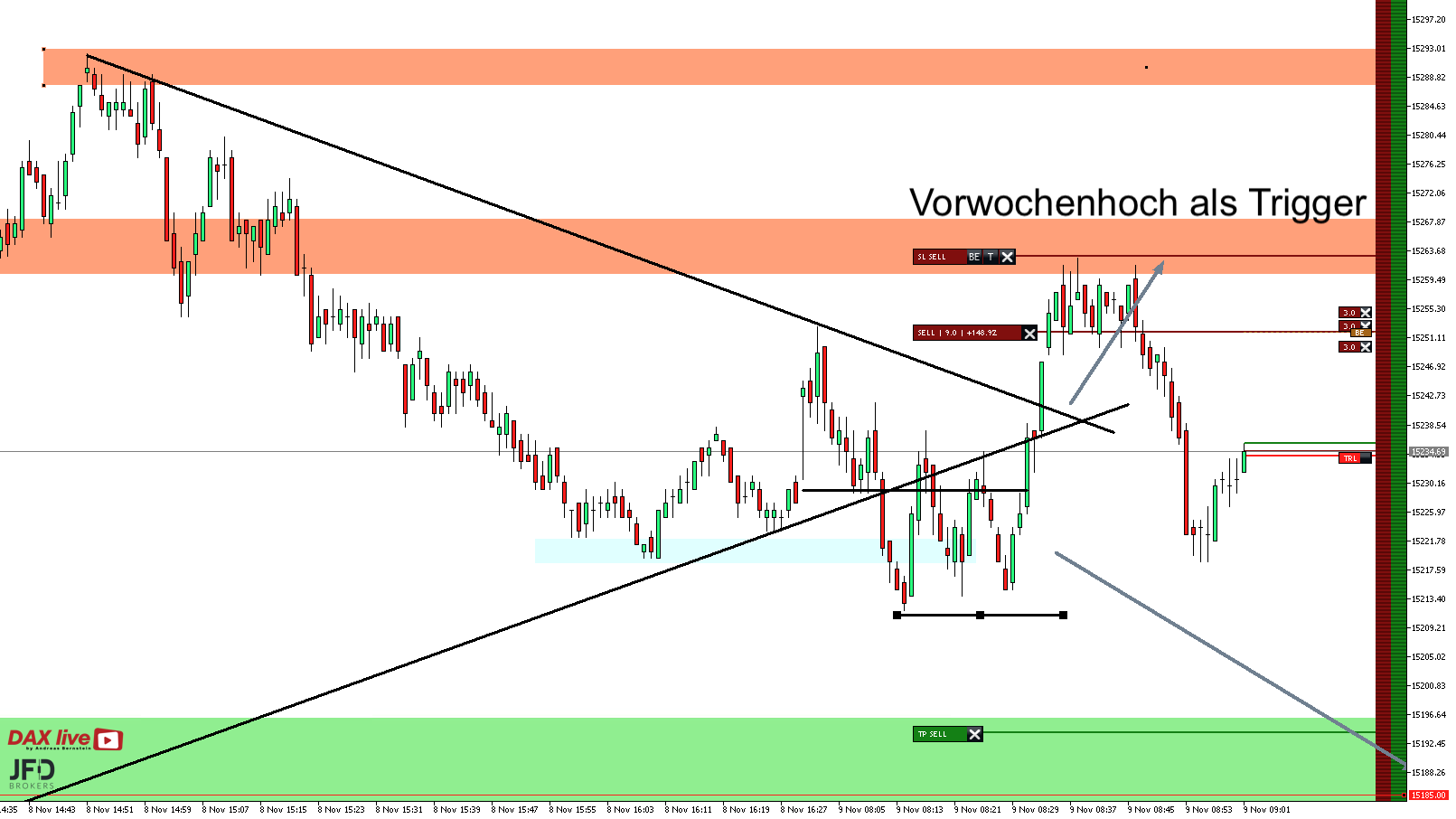 Der Stopp konnte nachgezogen werden, das Ziel wurde nicht erreicht. So kam es zur zweiten Intraday-Shortchance am Vorwochenhoch im Bereich der 15.260 Punkte: