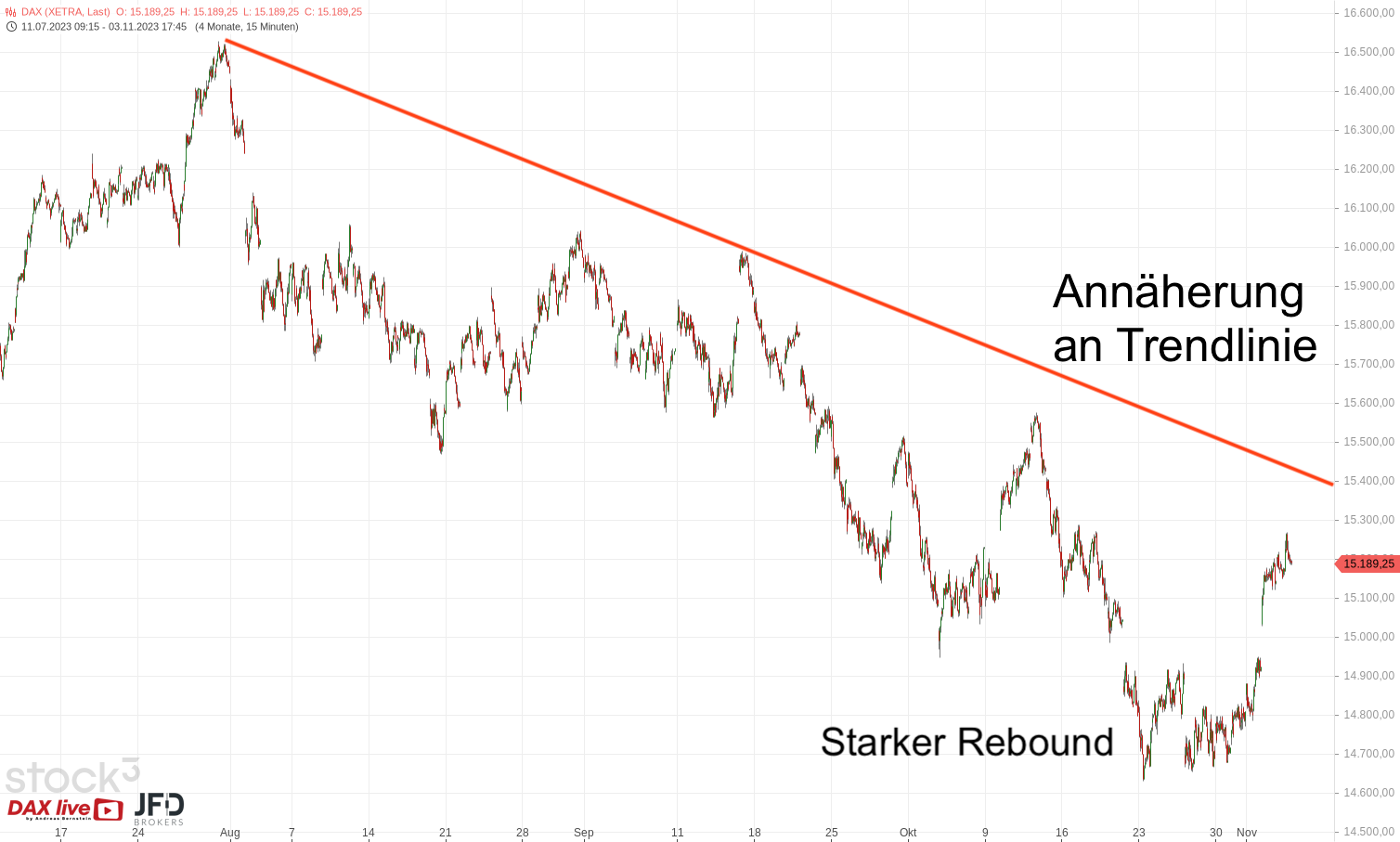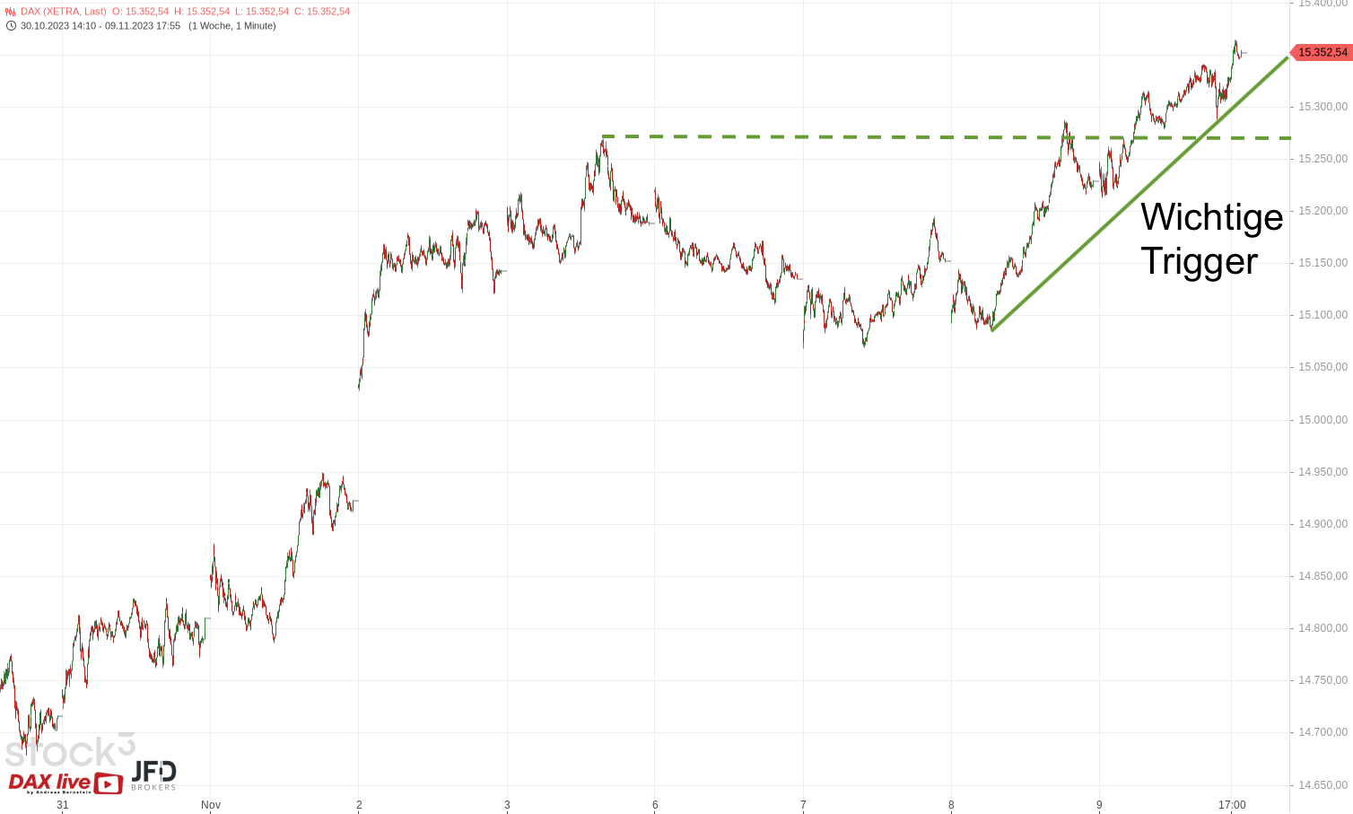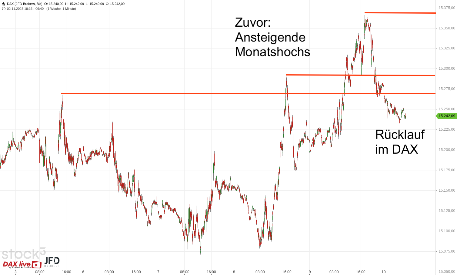 Der Stopp konnte nachgezogen werden, das Ziel wurde nicht erreicht. So kam es zur zweiten Intraday-Shortchance am Vorwochenhoch im Bereich der 15.260 Punkte: